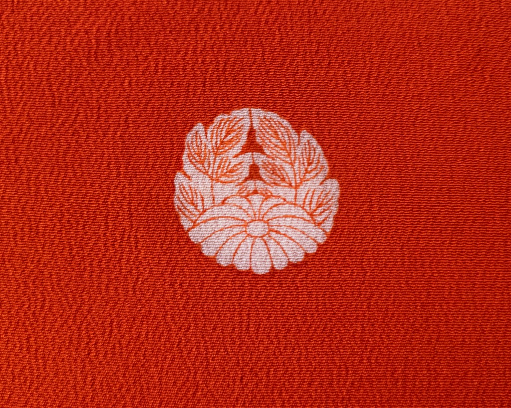 This is also one of my few five crested pieces that is not black. (For those just joining in, five crests suggests that it is a garment of the highest formality.) They are Gyoyo Kiku Kamon (Broad leaf and chrysanthemum crests). The whole piece is adorned with kasumi (haze, tsuru (cranes), and nami (waves) and the colour of the silk as it appears on screen–or at least my screen–is correct. It is screaming red. The hem is very slightly padded, giving it a nice weight. I have worn this one a few times, and it’s a delightful, breathable, wonderfully soft kimono.