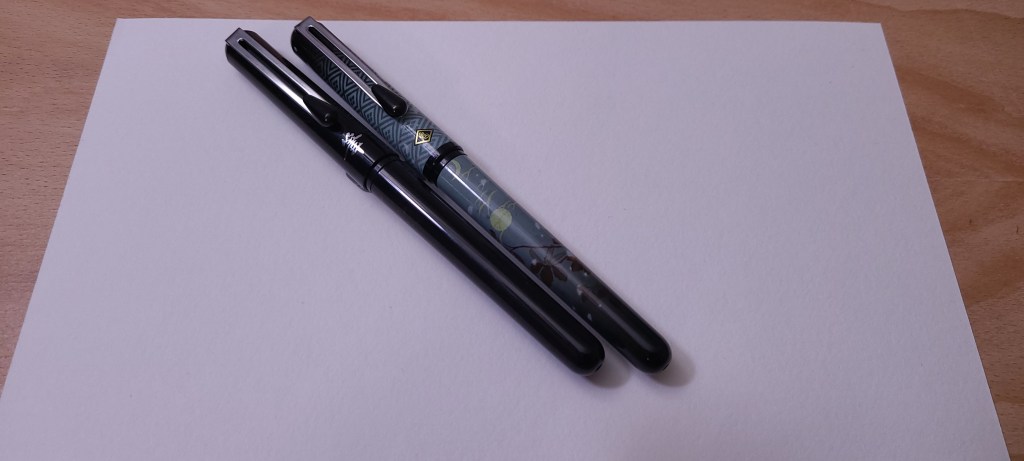 As the title would suggest, today I’m going to dick around with be showcasing the Pentel Pocket brush. The two models sitting on my desk here are specifically the GFKP, it comes in many colours and patterns. I have the solid black one, and the other is a special edition for a Japanese dating sim that I’ve never played and couldn’t tell you the name of because I’m too lazy to look it up. It was a gift and it’s cute as hell, so I have it.