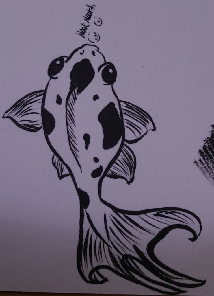 Here’s a fish I drew. Let’s name him…Fork. Fork says “Noot Noot.” Fork is only about three inches long in real life, and I sketched him in ink in about five minutes. This was to show off the pen’s actual drawing capabilities in this environment. Also I like goldfish. Say hi to everyone, Fork.