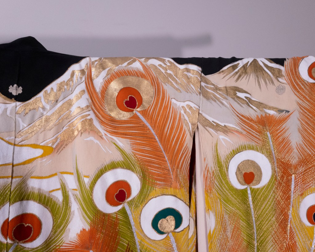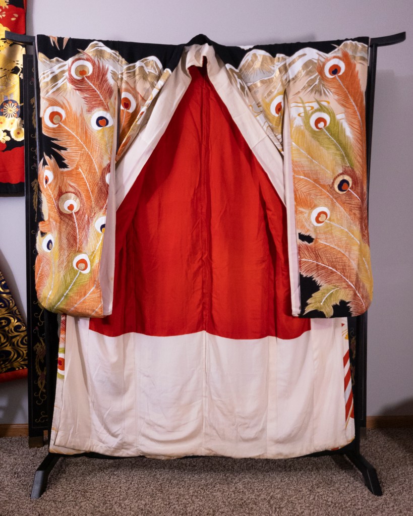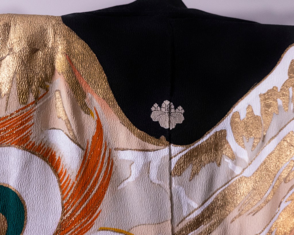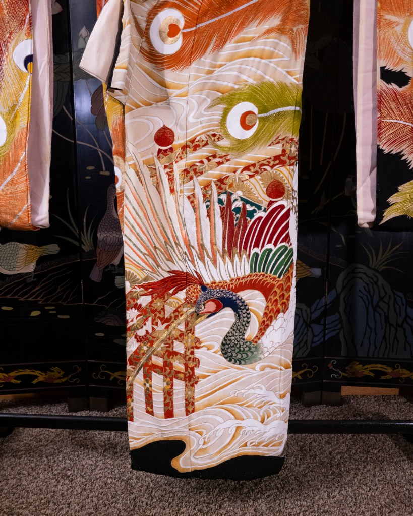 But! She’s clean, she’s tidy, and she’s whole again. She lives on my wall out of the sun, a fantastic display of gorgeous craftsmanship. A literal piece of art for a bride to wear on her wedding day. And it really is an explosion of colours! This furisode is adorned with five Kiri kamon (paulownia crests), making it very formal. As a side note, photographing this properly was not as difficult as restoring it…but it wasn’t easy, either. Kinsai glows. It also gives to some beautiful contrast of an insanely bright peacock, flying low over wild waves and stones and giving you the side eye and flashing his mighty gilded feathers against a backdrop of snow covered mountains. And for whatever that’s worth, I’m glad to have her.