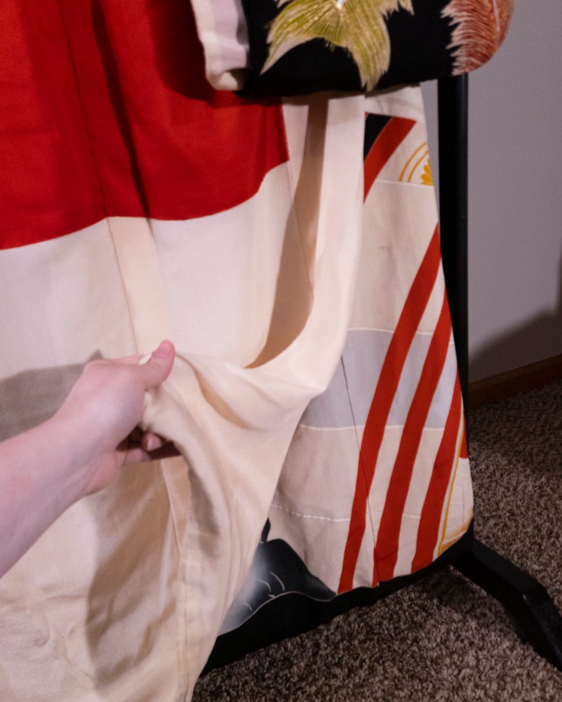 Between this furisode and the one I had restored before it, I had learned a valuable lesson. To temper my expectations after I can reasonably assess the project live and in person. Sometimes, even though my goal for every kimono I restore is to be as close to new and wearable as I can get it–well, sometimes that’s just not an option. This kimono wasn’t stored properly for a very long time. Even after all of that work, she’s still very fragile. I can control the damages to the fabric to a point, but they can’t be undone. I can conceal chunks of shattering beneath kinsai, and I can reinforce areas of wear, but the overall structural integrity of this piece is questionable at best. And so unfortunately, she’ll never be worn again. It’s just not safe. I can’t risk the further damage.