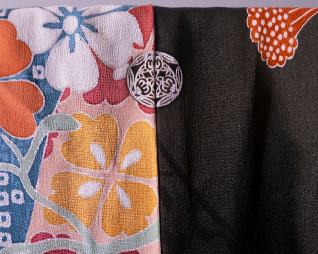 This kimono came to me in pretty good shape considering it was a domestic purchase. It was well cared for, and there’s very little to write home about aside from a small spot here, a little patina there. The only weird thing that sticks out to me is that it looks like someone resized it at some point, and that wasn’t the person it was originally tailored for. As you can see, there’s some black banding between the panels, were one part of the pattern abruptly ends and then continues a beat later. Like smashing the clone stamp tool in Photoshop, and being terribly irresponsible about it. Typically, these kimono are tailored for a specific individual, so the way the dyed pattern goes together between the panels is accounted for in those measurements. There’s more to it than that, but for the purposes of this blog entry, that’s fine. Well, this one was widened, and it shows. They did a fine job of it, the seams are neat and clean. I might pick it apart later and rejoin the pattern properly. I find it to be rather interesting, though.