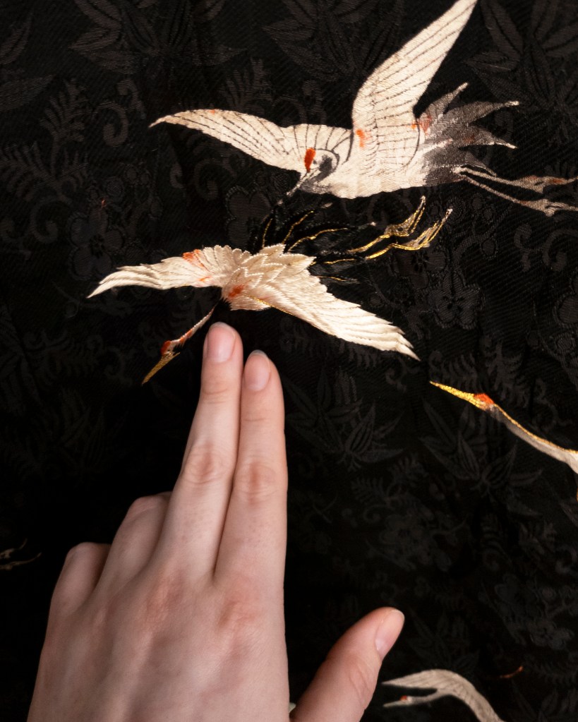 Then there’s the staining. Of course, we have some patina here and there. That’ll happen. The stuff that stands out to me are these red marks that appear on a few of the cranes and on the kamon (crest) that as at the very back of the kimono. Legit, it looks like someone dropped a marker on it. I’ve handled that before, and I’m already clenching my molars. Hear that? It’s the sound of my dentist putting a down payment on a fucking yacht.