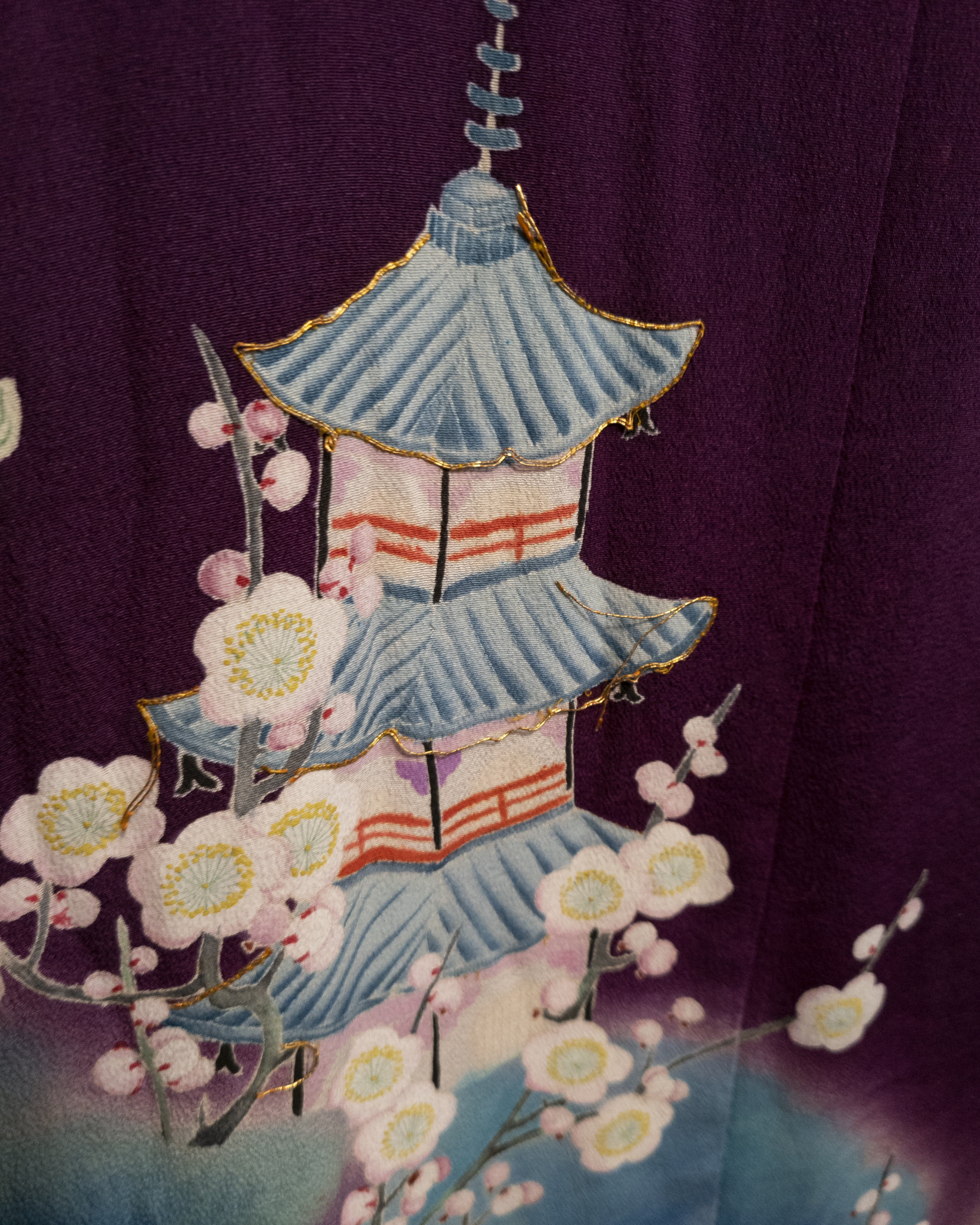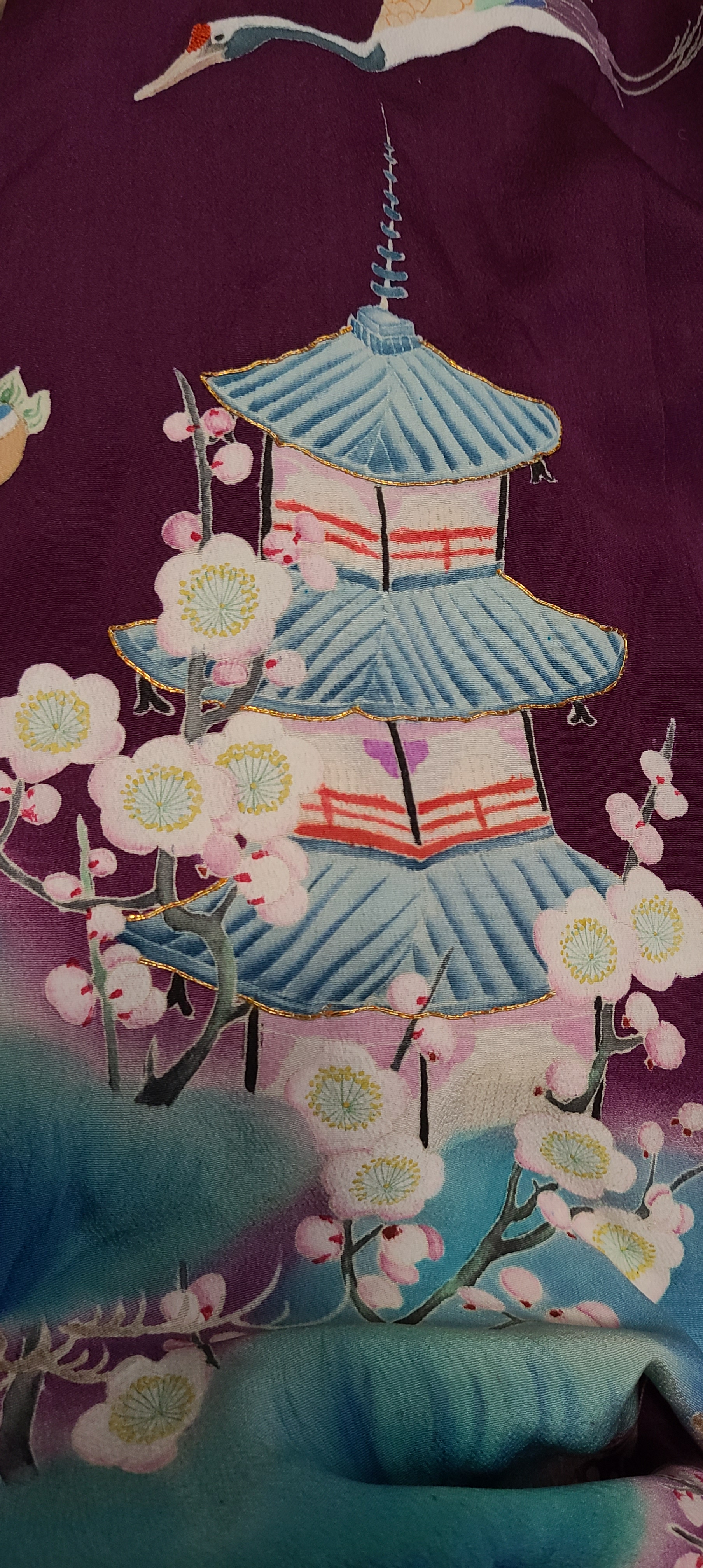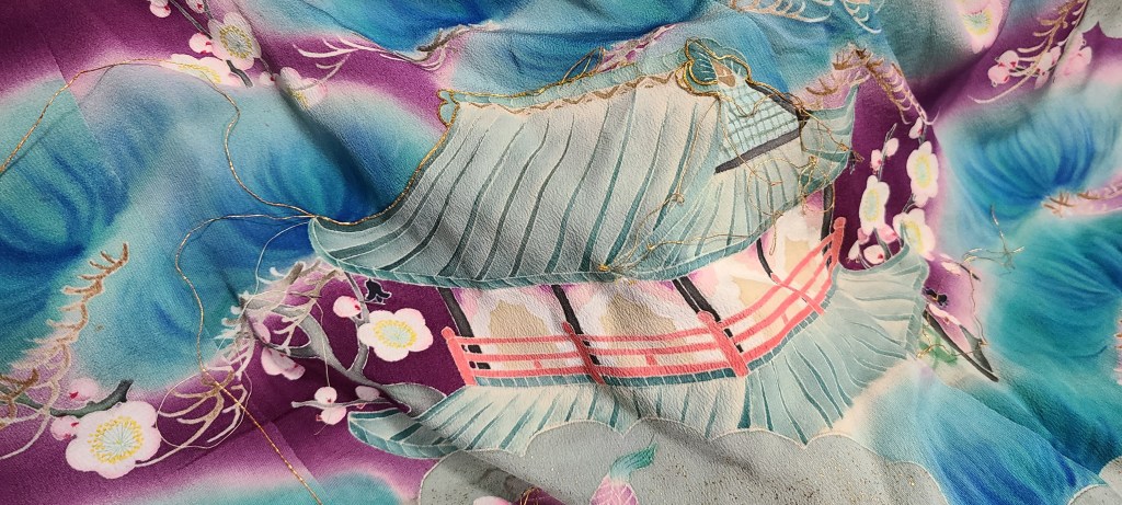 Now for some other shit interesting things I’ve learned doing research on this uchikake. I’ve named this series in a stupid way! From research done, and other sources asked, I’m reasonably sure that this is Yasaka Shrine in Kyoto, and not a castle. The large pagoda very closely resembles Yasaka no Tou, and the construction of the smaller buildings more closely resembles the shrine buildings there to me than it does any of the castles that I’ve researched.