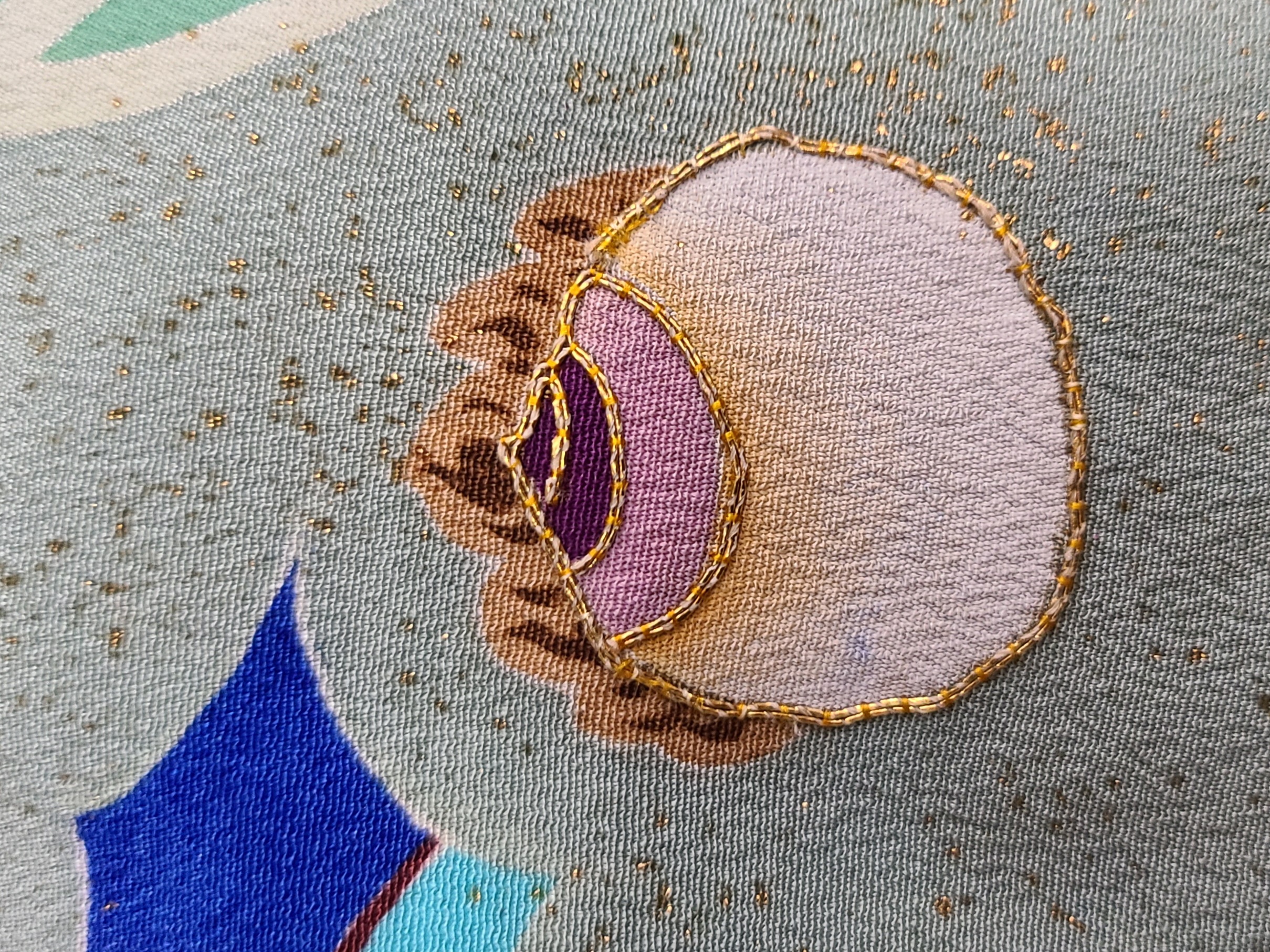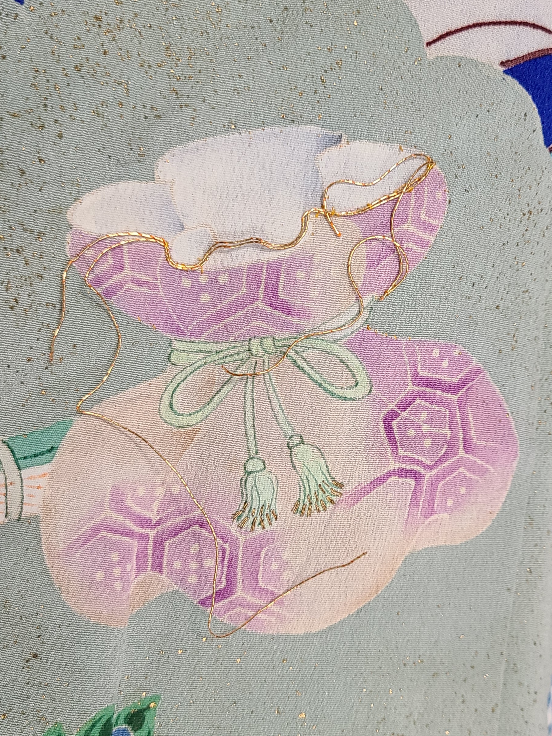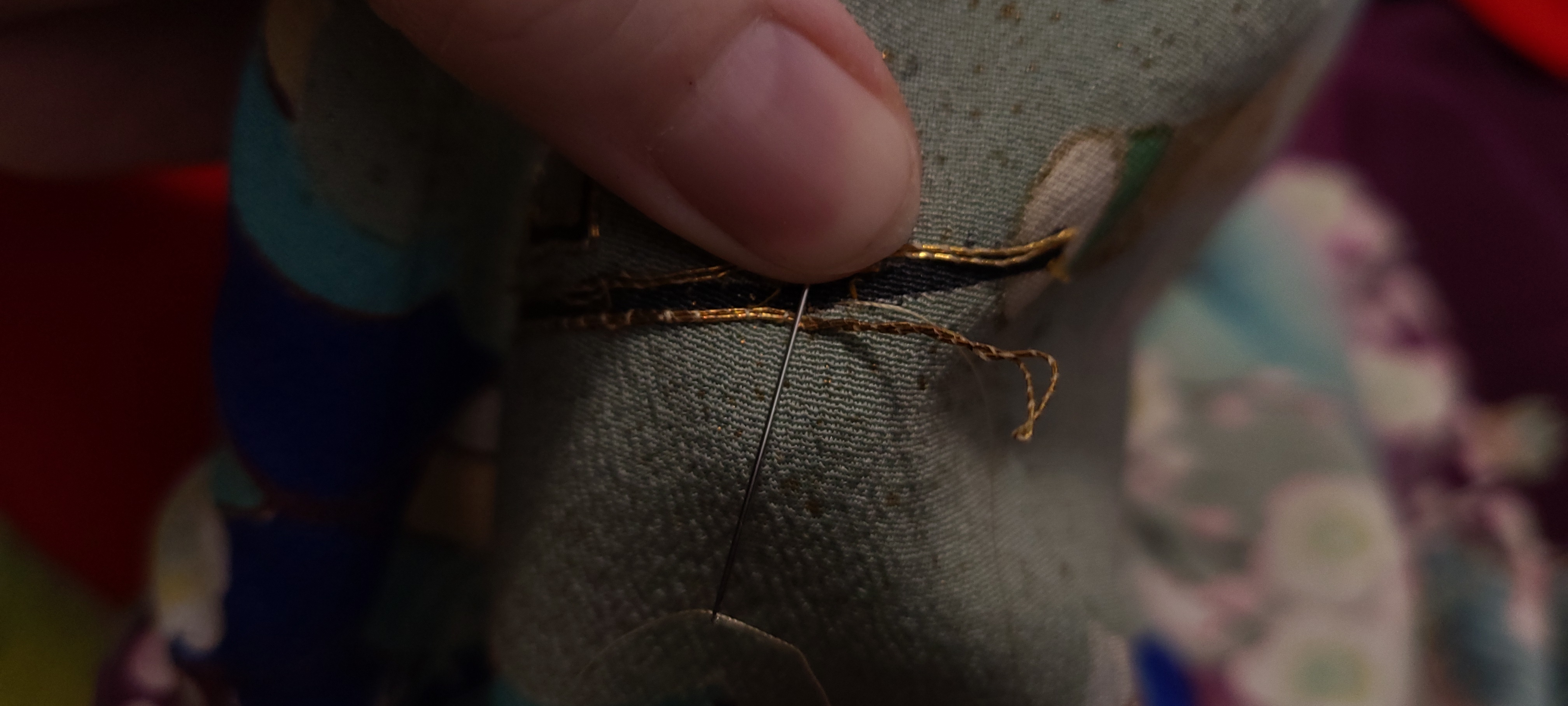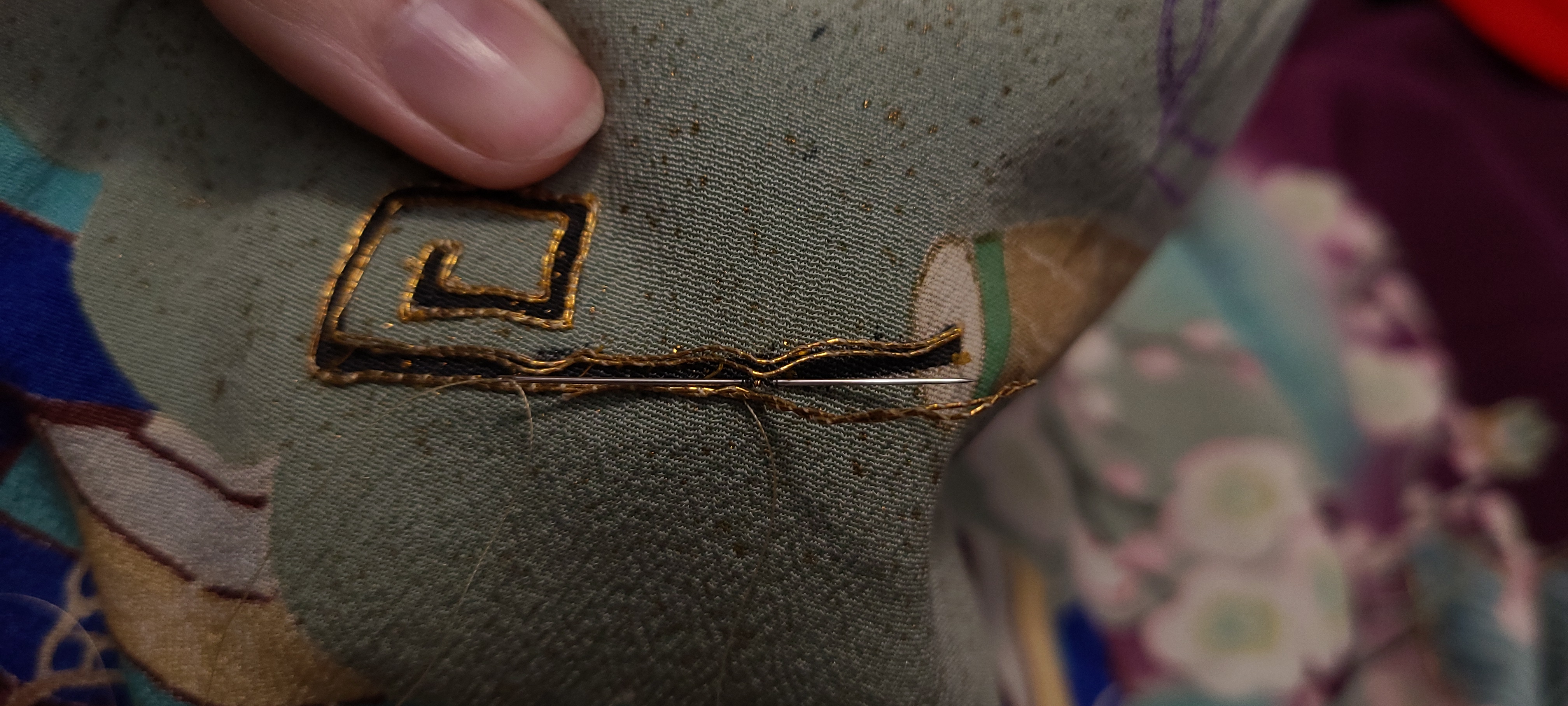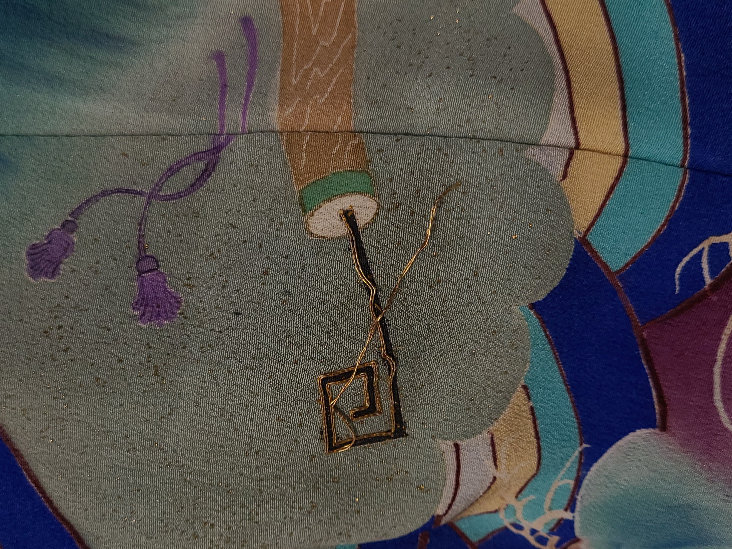 I’m making lots of great progress on this piece, gifted to me for restoration by Nancy from Kyoto Kimono. As predicted, most of my work is sewing. I had to wait for awhile to get the proper weight and color for threads in to get started, but now that they’re here, things are going very well! Couching is not particularly difficult–or at least I don’t find it to be. It is extremely time consuming, though. So hahaha oh my god fucking kill me progress is slow and steady.