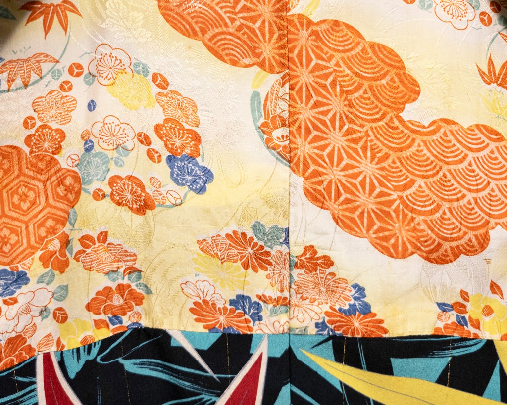 Anyway, what we have here is a Taisho Era women’s haori (kimono jacket). It bears no kamon (family crests), and would be considered quite informal, even though it has metallic threads. It’s adorned with an explosion of stylized sasa (bamboo leaves), and has a candy sweet lining with a rinzu (woven) pattern of kiku (chrysanthemums), and a dyed pattern of ume (plum blossoms), kiku, sasa, tsubaki (camellia), and poofy clouds of asanoha (hemp leaves) and seigaiha (seashell looking waves). I place this one in the Taisho Era because, and let me be very clear, fucking look at it. The sleeve length, the texture, the screaming colours. Having direct provenance on a kimono is often rare. Unless I’m buying from Japan or the original owner, I often don’t have it at all, and that’s true for this one, too. The person I bought it from said their uncle brought it back in the 40’s. (Eyeball twitch.) But I think anyone else who reads this and understands what I’m fixing up here probably also understands that sometimes, you just know.