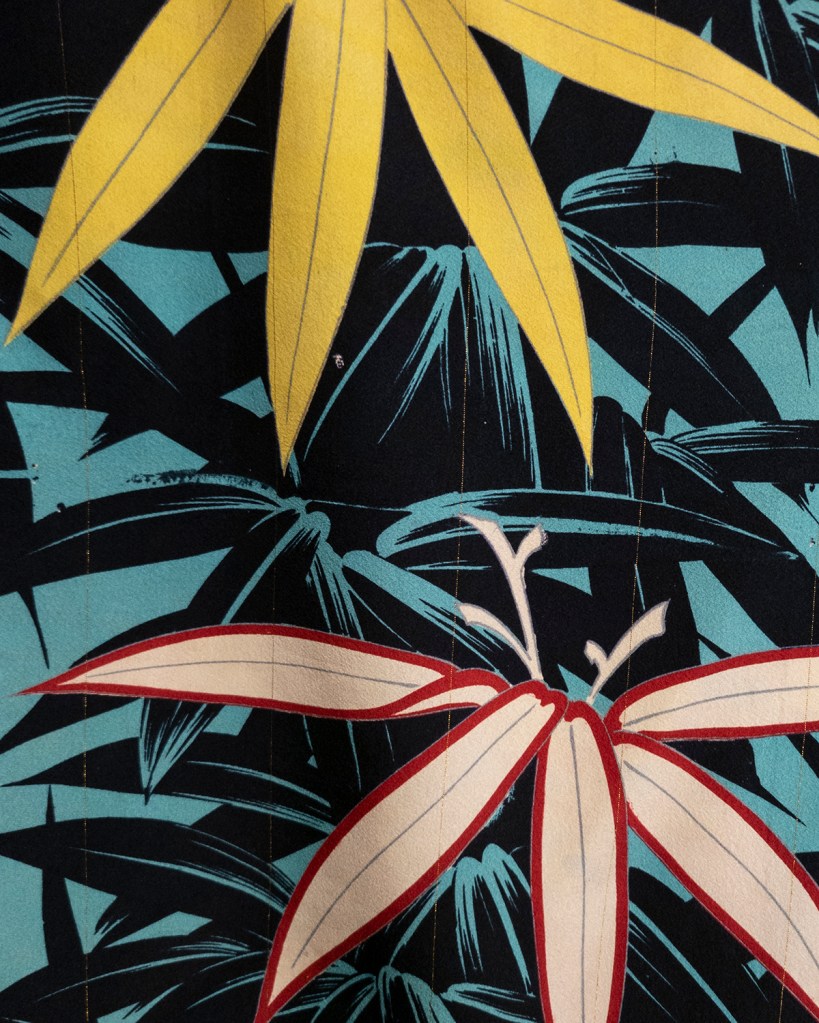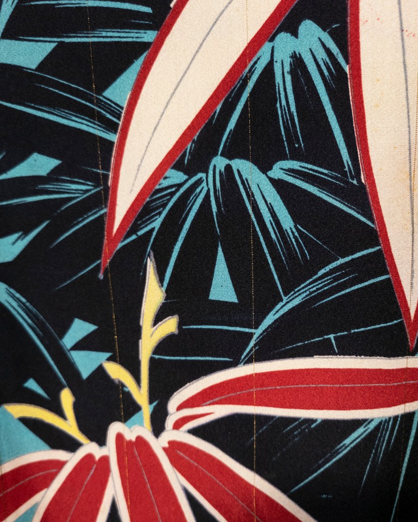 This is the Hawaiian shirt of haori, and I’m here for it. Look at this majestic creature. And when your eyes refocus, look at it again! Can you hear that? It’s the sound of how fucking loud this thing is. And yet when you’re with it in person, it’s actually rather easy to observe. Light falls on this beast in a strange way, and I think that it’s probably true for most Taisho Era pieces. There’s a softness to them that you’ve probably seen me struggle to describe properly a few times now. It’s not just the near liquid milky smoothness of the silk; it’s the way that it fills a space. The way light falls over the woven fabric and makes the patterns so much bolder, and yet so gentle in their spaces. Look at this one–it’s unmistakably old, and yet the explosion of colours invites a young, dreamy sense. Or at least I think it does.
