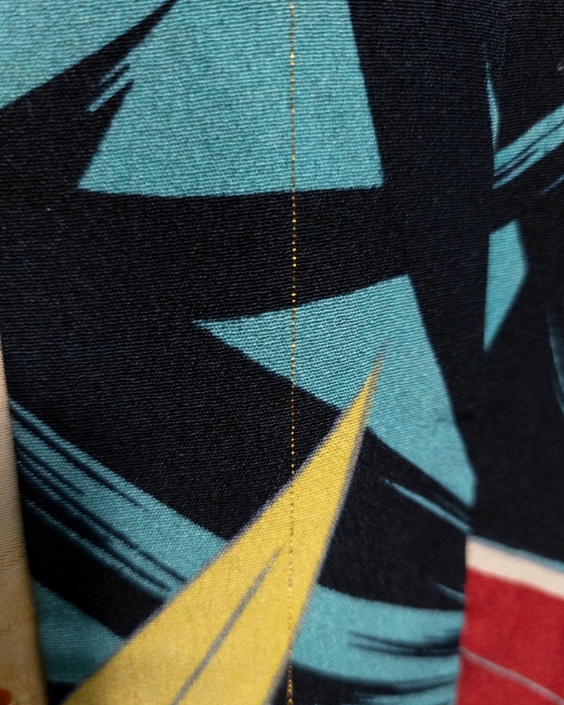 At the tips of the sleeves there were a few suspect stains, and because I purchased this one long before COVID O’Clock, I was still in the habit of touching certain stains to my tongue occasionally to see if I could tell what it was. This is your semi-regular blog entry warning that I am arguably insane and not to fucking do that, because 1) this isn’t the year to fuck around with that, and 2) yes I have put…fluids…in my mouth because of it. Do not. Do this. Anyway, there was what I was pretty sure was Sweet Baby Ray’s Honey BBQ on the sleeve. I hit it with vinegar as described in this post, and that got most of it out. There are still some faded areas where I could have been more aggressive, but I just didn’t feel the need to put that kind of stress on the silk, because you have to be like three inches away from them in order to see them. And let’s be real, if someone’s that close to me, that’s what the bear mace is for.