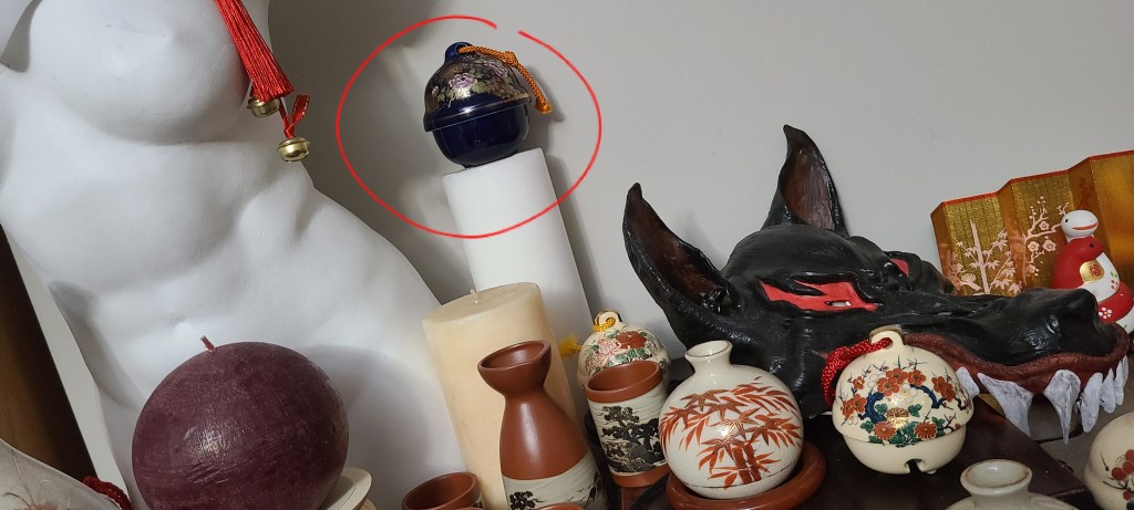 I have a collection of little Satsuma bells I have a ton of basically the same one, and I would like a thousand more of them please. They wander. The blue here one decided that it lives on top of a candle now. If I take it down, it will be back there when I leave and come back. I’ve stopped trying to move it. Okay, follow your dreams I guess, haori ghost.