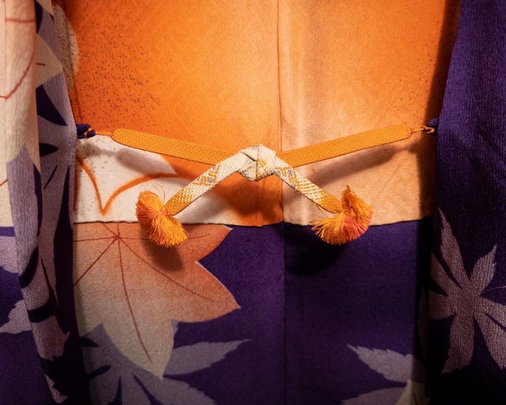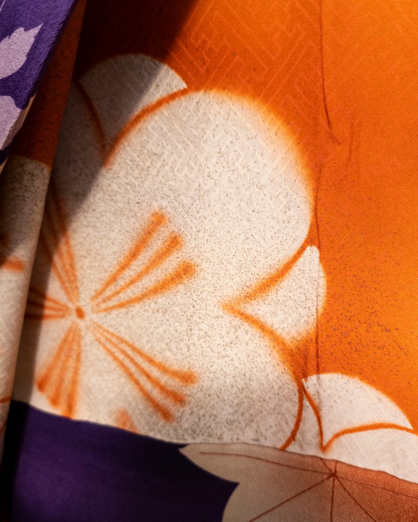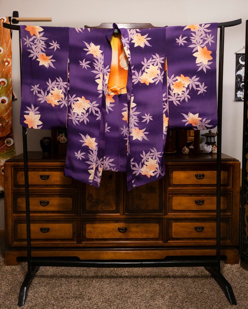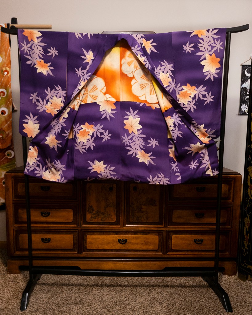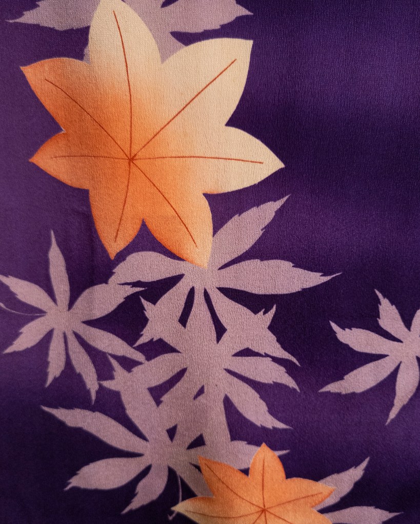 I spend a lot of time gushing about how indescribably soft antique kimonos are, and this one is no different. The silk is just milky smooth, and I’m once again torn between wanting to shove it in the hands of anyone and everyone and shriek about it, and being ready with the bear mace because personal space is a big deal. Why is life so complicated? Haha…problems. The decadent purple is arranged in a soft pattern of kasumi (haze) with both momiji and kaede (different Japanese maple leaves); the momiji in a lighter purple, and the kaede in candy sweet orange. The lining is also made of silk and it has a rinzu (woven) pattern of sayagata with actual kinsai (gold paint) dusted on the lining on top of the orange stylized ume (plum blossoms), and the lining silk is every bit as soft and smooth as the shell.