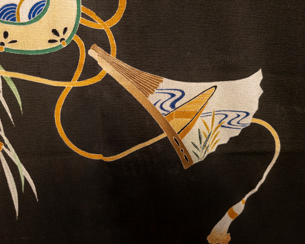 The silk is decorated with yuzen dyed tsuzumi(little hand drum) and what I’m actually convinced is a bachi (pick used to play a stringed instrument such as a shamisen) stylized to look like sensu (fan), surrounded by yanagi (weeping willow). The tsuzumi is decorated with seigaiha (small waves) and nadeshiko (dianthus flower). The bachi has an adorable little boat on it. If you get really close to it, which you can’t because you’re in internet land and I’m here, you can see that the “right side” of the design is actually facing inward, between the layers of silk gauze. And in there, the different outlines of the designs are lined with silver. It actually glitters just slightly in the sunlight.