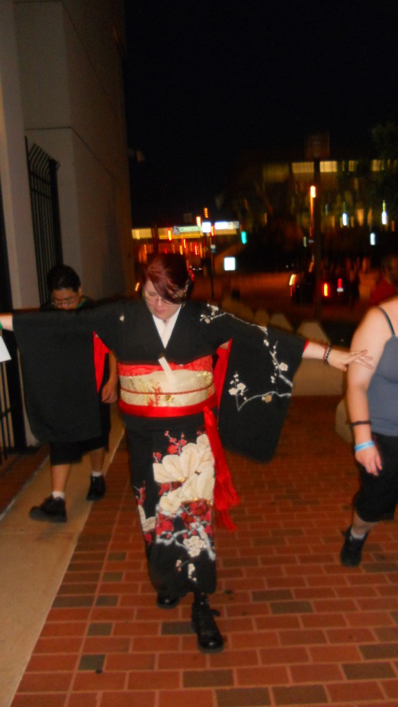 It was the ass-end of July, 2011. I was almost 25, and at an anime convention in Baltimore, Maryland called Otakon. That night, I had met the lovely Nancy McDonough of Kyoto Kimono, who I just recently crossed paths with again when she gave me this beautiful uchikake to restore (which will be done in the next few days). I had received a million compliments on my outfit, even though I was wearing regular-ass shoes because the zori were hurting my feet by that time of night. It was hot as fuck, but we were in good spirits. I was with my husband (just behind me giggling), my sister (out of frame), and my brother in law (took the picture) as I raced up the street from the convention center making very loud airplane noises with my “wings” out. Because yes, I have always been like this. It was that or ORK ORK ORK like an awkward seal, and it was just too hot for that.