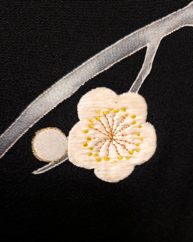 Let’s talk about the details on this piece, because there’s a lot to talk about. With ume and matsu (pine), this is a seasonal piece meant for winter. But I wear it whenever I please because, as I like to say, fuck the police. The petals and pollens of the little plum blossoms are lined in kinsai (gold paint), and much of the pine sprigs are embellished with gold couching.