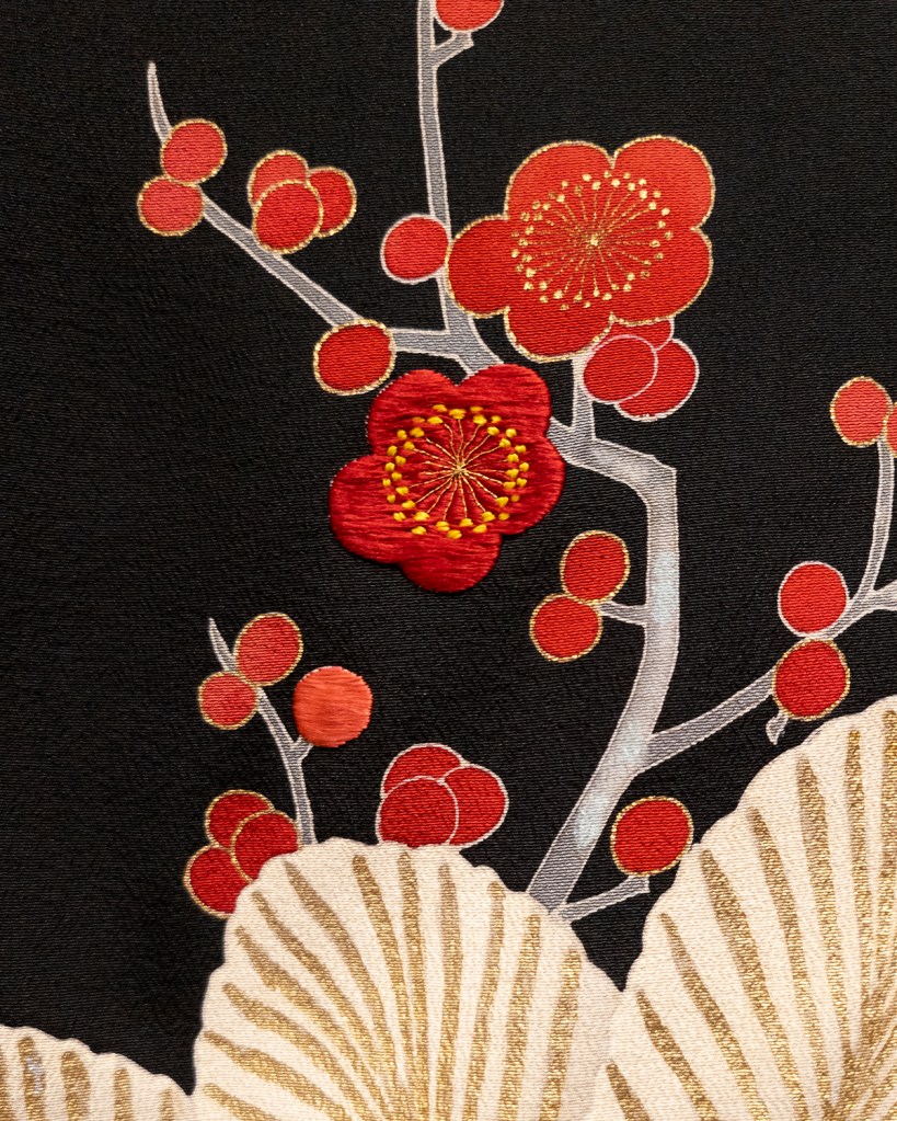 Back then, I didn’t think to save much in the way of seller photos or details. This wasn’t anything even approaching a restoration, so it’s not a huge loss. I remember that the original seller was knowledgeable about it and very kind to talk to me about it, too. They told me that it was a piece from the Taisho Era, but didn’t give me a specific date–or at least none that I can remember. I’m not feeling inclined to argue with them. The sleeve length, the amazing red lining, the beautiful gradient from red to pink to white in some of the ume (plum blossoms), the texture of the silk; these are all very classically Taisho style things.