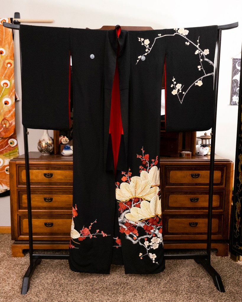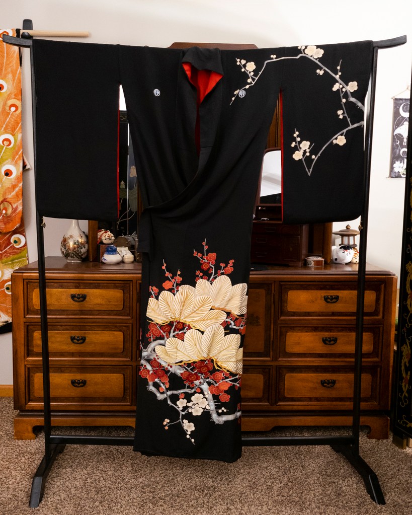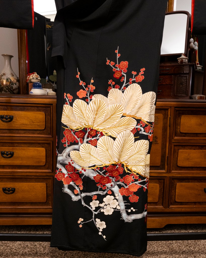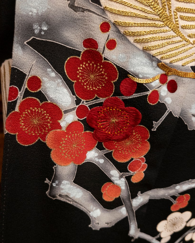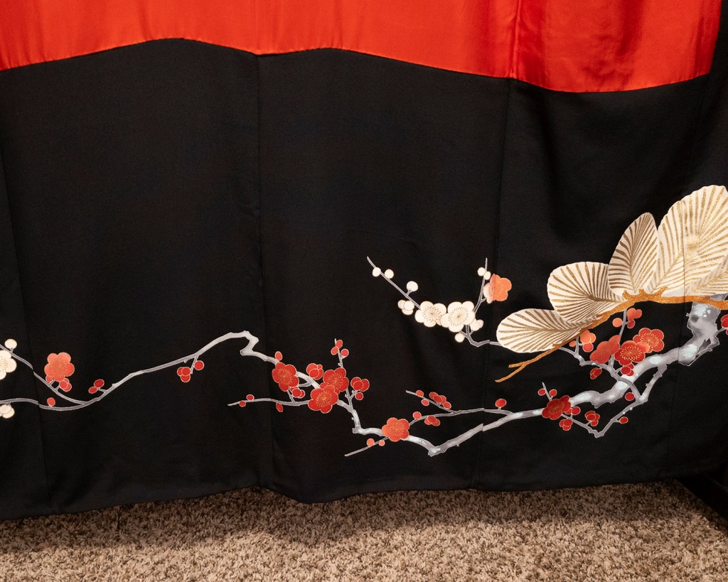 What drew me to this one is because ume (plum blossoms) is possibly my favorite theme. Okay that word is almost meaningless again; yes I make the rules and no you can’t speak to my manager. But screaming blood red ume on black silk just made my heart explode, and I had to have it. I had also never seen what I thought at the time was a kurotomesode (specific formal black kimono with five crests) with a pattern above the skirt other than the kamon (family crests).