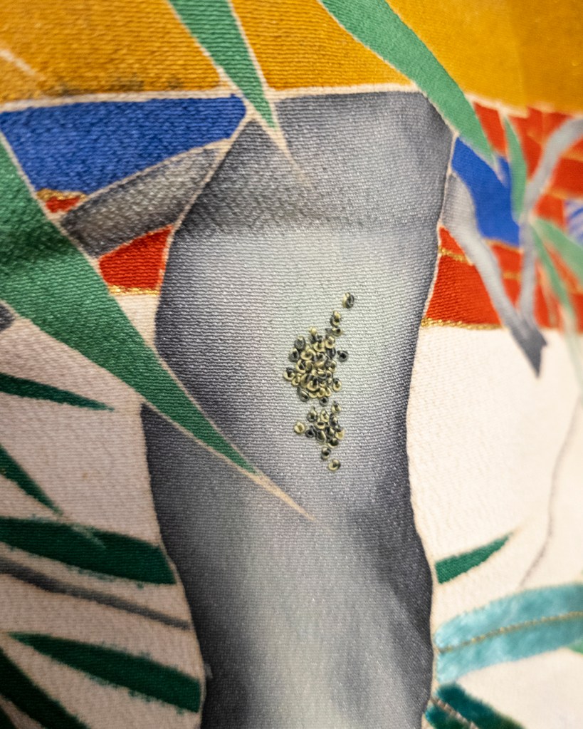 And the best part? I don’t have to repair or restore a goddamn thing. I legitimately can’t find anything wrong with this beauty. The kinsai is all intact with maybe some really superficial cracking if I’m being extremely anal retentive about it, the couching is solid and shiny, the embroidery is perfect and smooth. I can’t find any stains, although I did find a smudge or two that scratched right off. There is no fading. The only imperfections that I can find on her are the fact that she was quite a bit wrinkled–which I treated with a very slow and gentle steaming, but will otherwise be allowed to hang out–and then there are small errors in the yuzen (resist dye technique) that are actually present on pretty much every kimono of its time. Fight me.