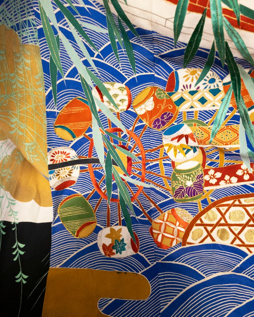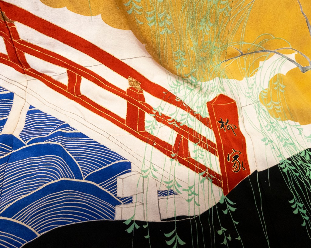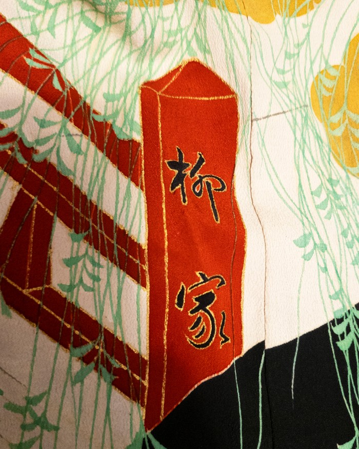 …says 柳家, or “Yanagiya.” Which is (was?) an Okiya in Akita. Based on what little information we can find–and I keep saying we, but I literally mean the one person in this equation that can actually read any of it–it seems possible that this was a geiko hikizuri from that Okiya. I don’t know if it’s one of a kind or not, but I can’t seem to find anything else that quite looks like it.
