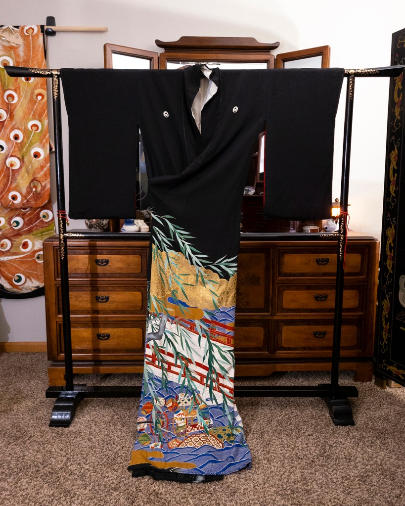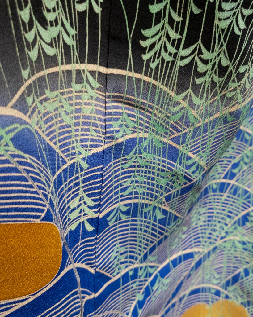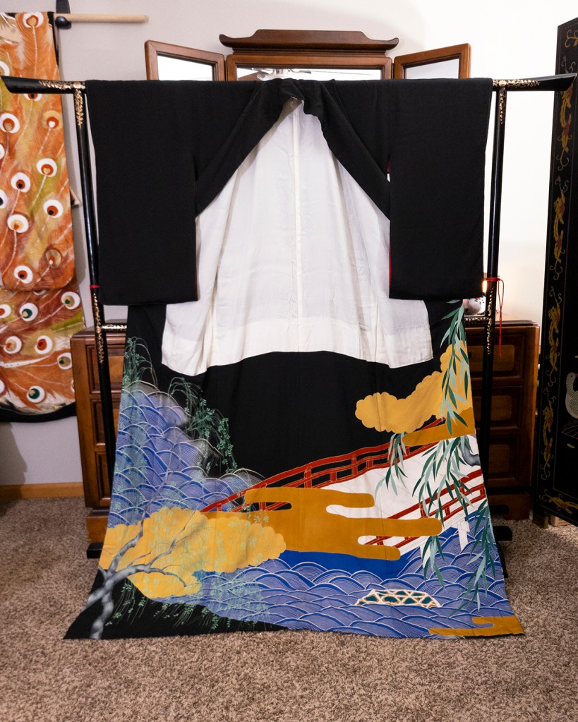 When I made the decision to buy it, I didn’t think it was anything other an antique kurotomesode (auspicious formal black women’s kimono with five crests). There were no measurements listed, and there was nothing to compare it to in the frame. In fact, there was only one photo of this kimono in the listing, and it was from the front. I knew it was going to be Pre-WWII, so late Taisho to early Showa Era because of the beautiful red lining poking out of those sleeves; and provenance from the seller was that their father brought them home from the Pacific Theater, so that tracks. Beyond that, I was kind of going in blind. Legit, I saw the weeping willow and smashed the Buy It Now button with extreme prejudice.
