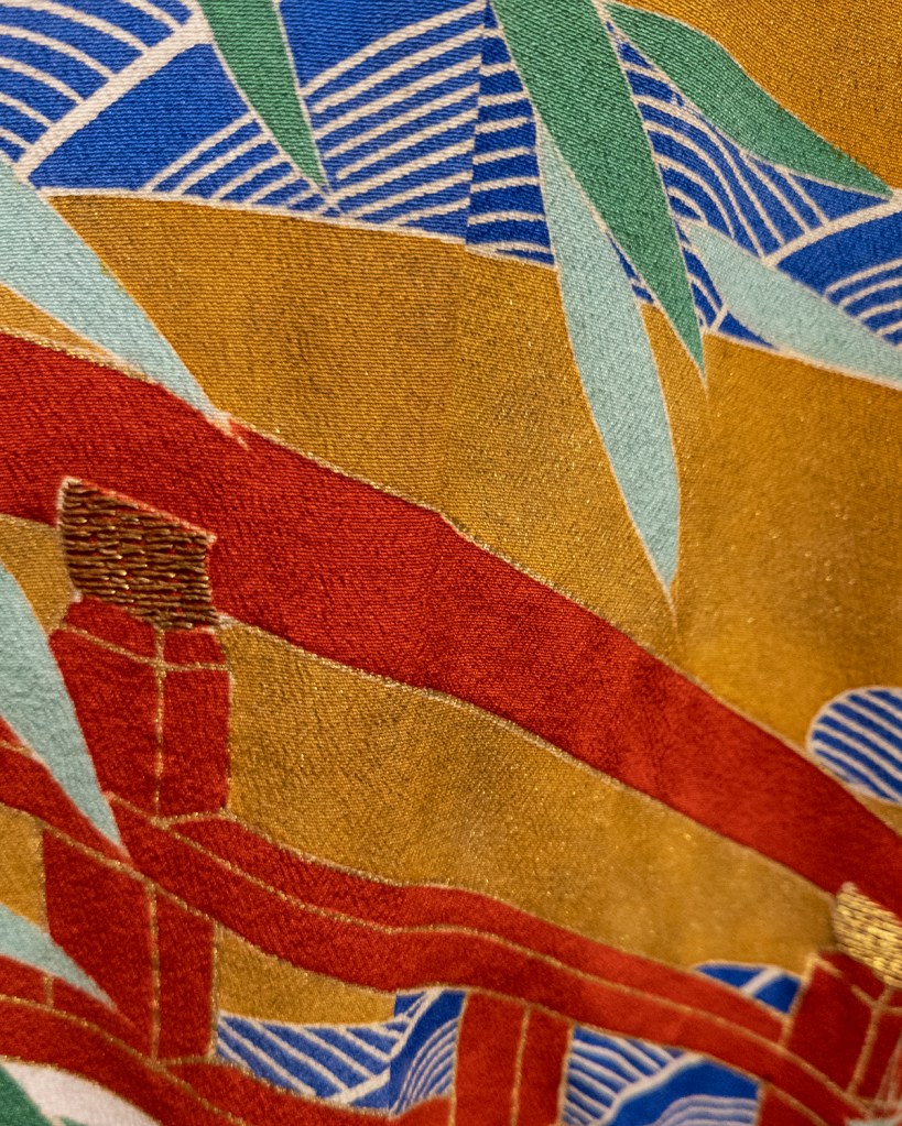 The design even continues on the inside to the hakkake (lower skirt lining), and the kinsai and embroidery follows even there. In my experience many kimono, even formal and decadent for the sake of decadent pieces, actually don’t bother with that last bit. They might have a highly decorated hakkake, but it usually doesn’t have its own embroidery.