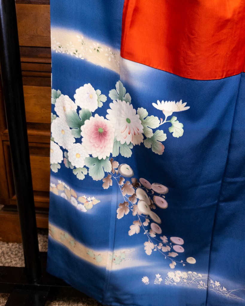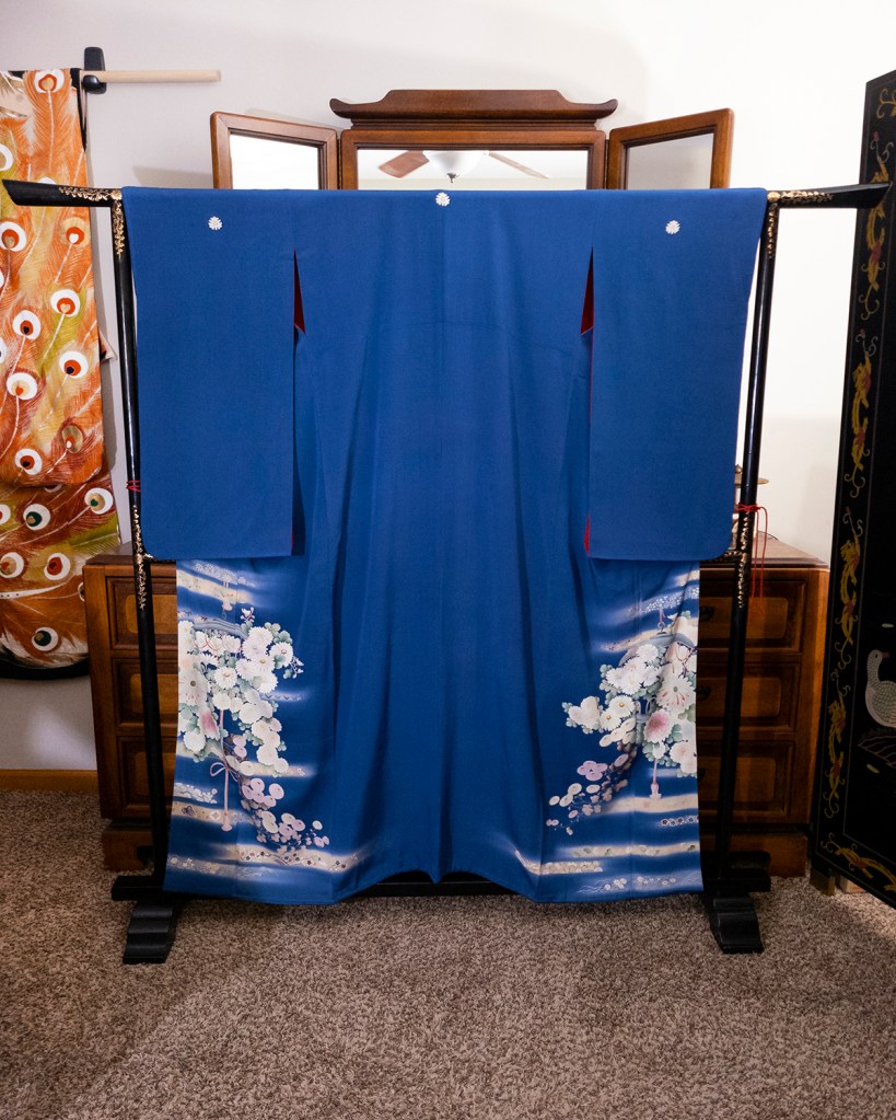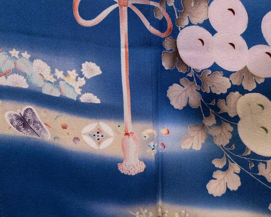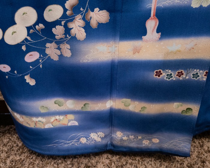 Note: This is one of those things that’s “weird to me” and not necessarily actually strange. My personal collection of furisode tend toward closer symmetry around the kamon–that doesn’t mean I believe that’s always true. Especially when the pattern around the kamon is part of a larger theme.