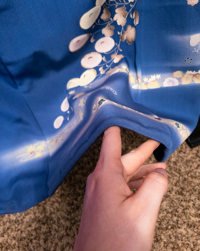 Let’s talk about the reasons I thought this might be a furisode that got the chop. Aside from the decorations around the kamon, the hem is slightly padded. Behold!