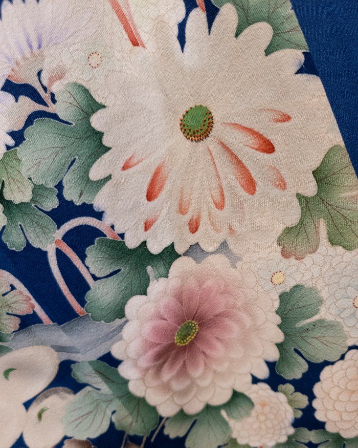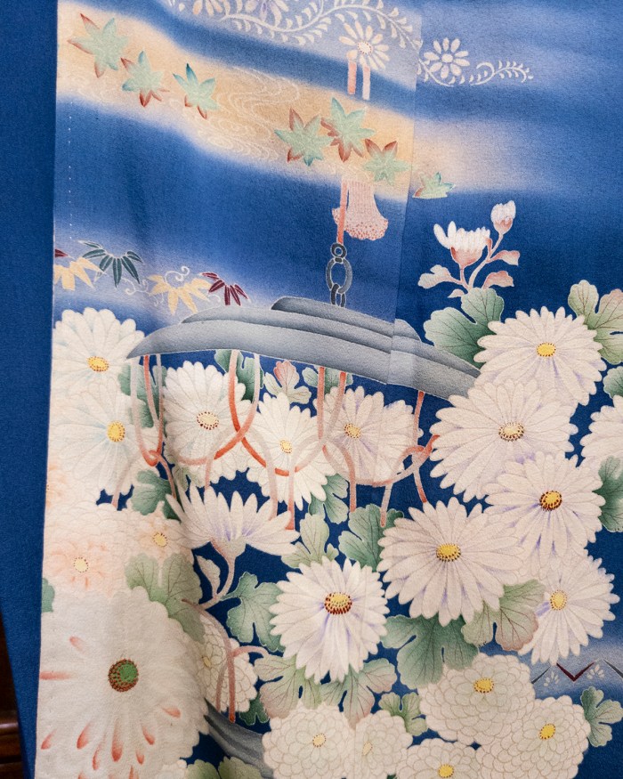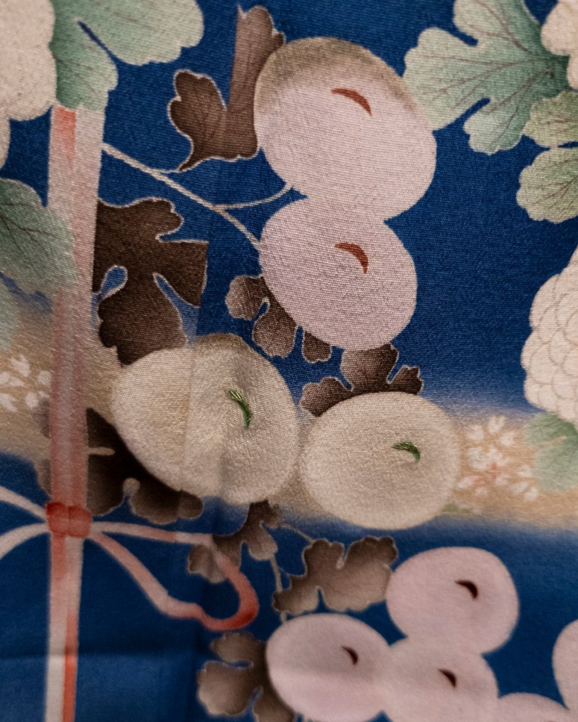 So here at the end, I’ll just wrap this up with saying what it is. A fantastic antique formal kimono with explosions of kiku (chrysanthemum), delicate tsuta (ivy), treasures, and kasumi (haze), with five tachibana (citrus) kamon (family crest). Whatever she is, whatever she was for, I’m proud to have her in my collection of unique things.