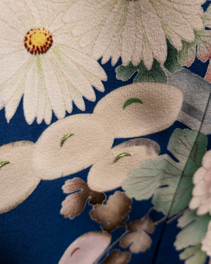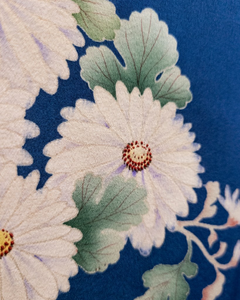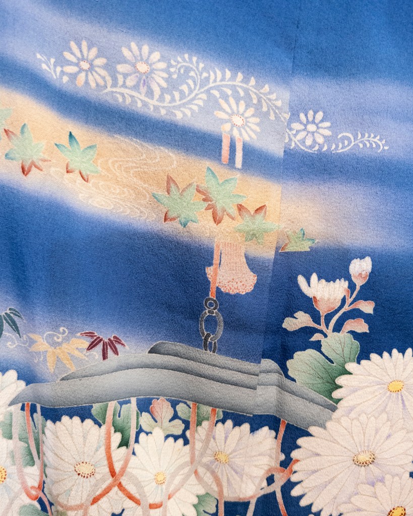 Up at the top where the kamon (crests) are, we can see that the clusters of kiku (chrysanthemums) are not symmetrical, and neither are the dyed kasumi (haze).