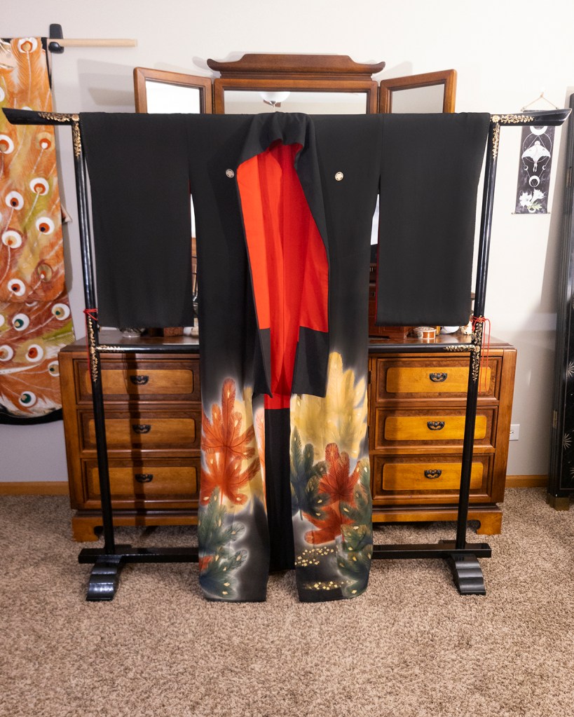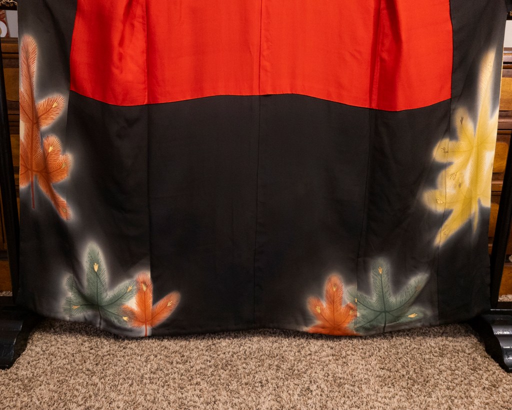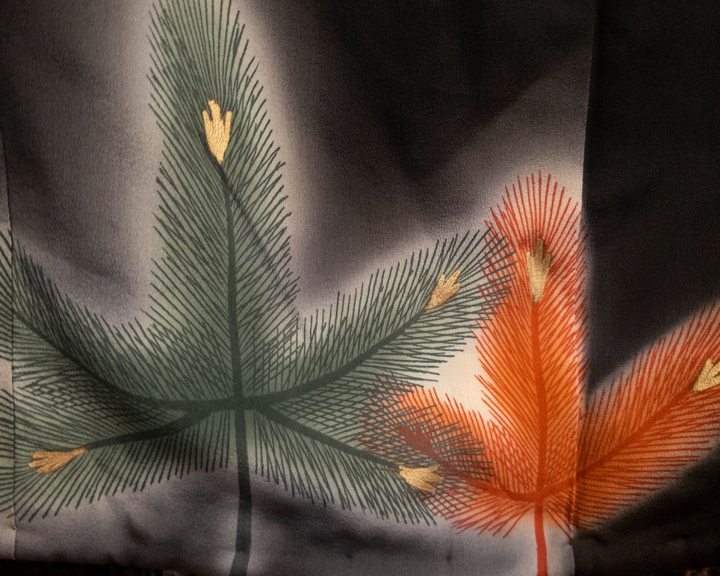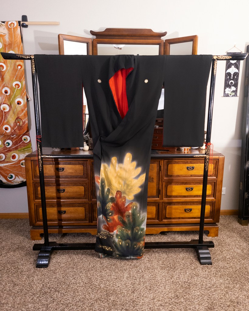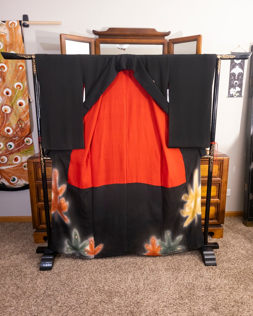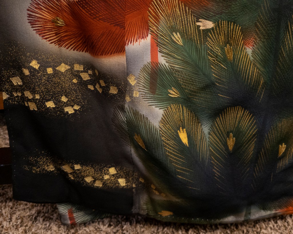 This kurotomesode (married women’s auspicious formal black kimono with five crests) was purchased direct from Japan probably in late 2009, so I’ve had it for awhile. I was told at the time by the original seller that it was a Taisho Era piece and I’ve marked it as such even though I don’t have an exact year of manufacture. Typically, I’m actually pretty goddamn strict about labeling things like that, as I’ve said before, because of how short that era was and how desirable its items are. I’ve made an exception here, and the reality is that I’m actually just not feeling particularly inclined to argue with the person that sold it to me. Between the rich texture of the silk, the screaming red lining, the gradient between black and hazy grey behind the pines, and the layers and layers of tones to create the pine needles? Close enough.