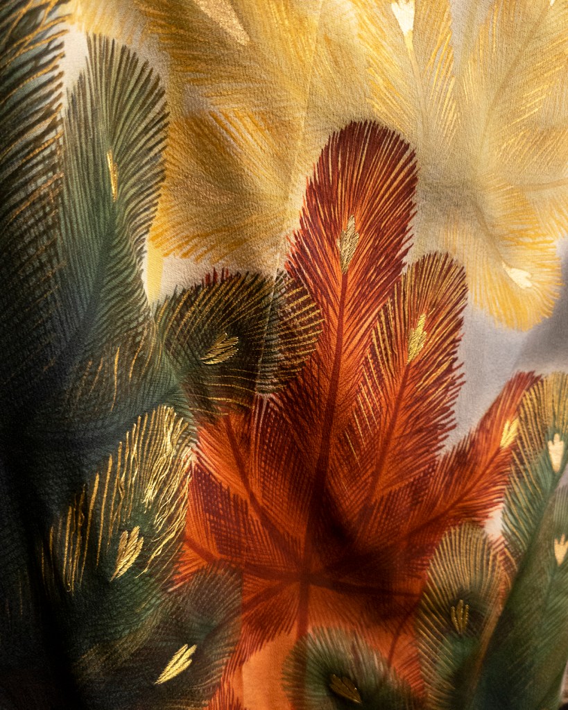 Vibrant Young Pine Growth With Gilded Fronds On Black Silk.