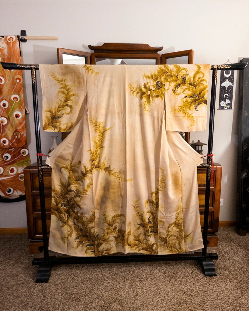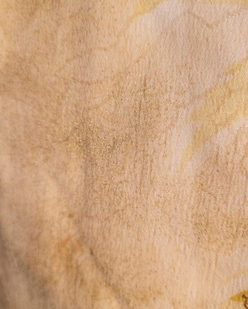 What the fuck is that? I hear you asking, because words are weird and I’m arguably insane. In this context, sizing refers to the adhesive media that was used to make the gold stick to the kimono. And this kimono has a decent amount of kinsai (gold paint) on it. This includes a bunch of hazy clouds of gold powder technique like this: