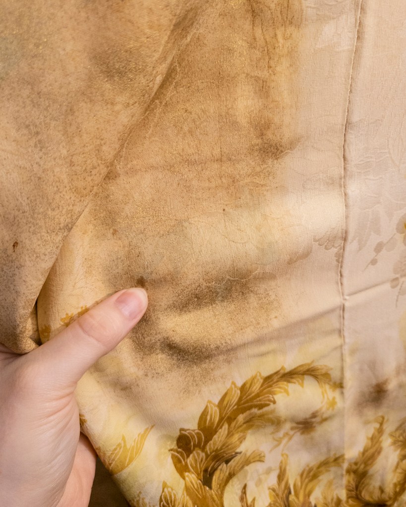 So I picked this kimono because from the seller photos, it looked like I had some nice hard mildew stains on light rinzu silk to handle. It also looked absolutely fuuuuuuuuuucked. Yes, I needed that many u’s. The ability to screech my obscenities at things when getting ready to do the hard work is a matter of necessity. Anyway, that means if I couldn’t remove the stains with my proven safe methods, it was a lost cause, which means I have a new lab rat to play with. .