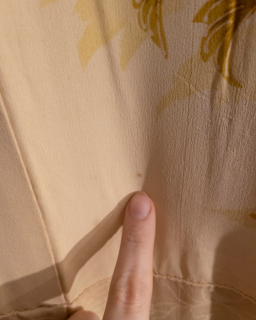 This is actually what I thought to be mildew or something because of the greyish greenish tint present in the seller photos, and because of the tint here. When it arrived here, this kimono is significantly warmer in hue than I thought it was, but getting close to this stain revealed that it is not mildew. In fact, the big clouds of gunky crap that I thought was mold or whatever isn’t mold at all. It’s sizing decay.