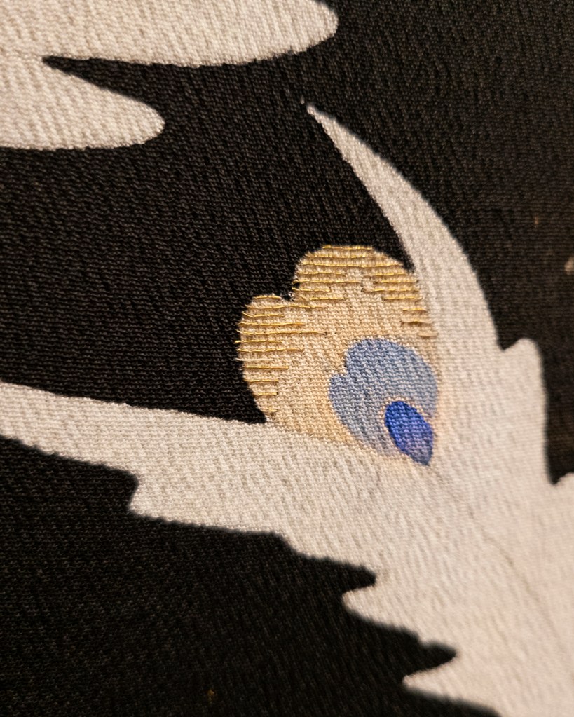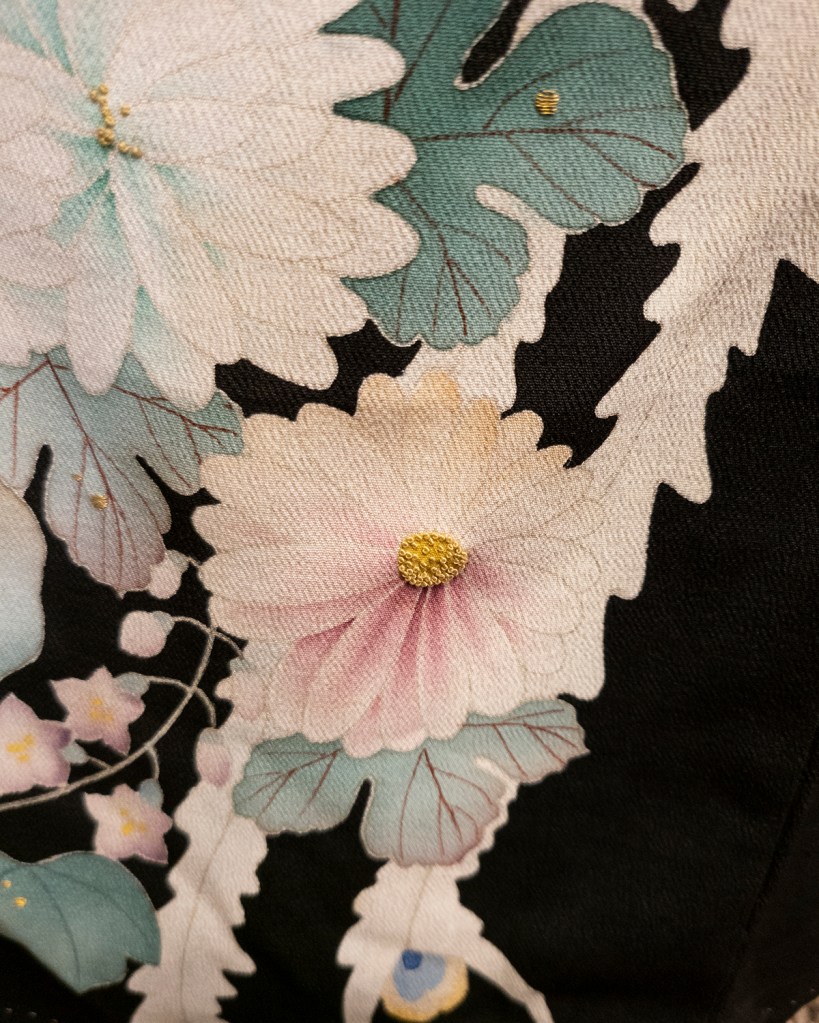 I guess there actually isn’t much else to say about this one, so let’s move on to the facts. This is a kurotomesode (a married women’s formal black kimono with five crests and a design below the hem), that boasts five variants of the mokko (a species of rose like flower) kamon (family crest), a delightfully snarky and sassy houou (phoenix), surrounded by kiku (chrysanthemums) and kiri (paulownia) blooms, and matsu (pine). There are delicate gold embroidery accents on various parts that continue inside the hakkake.