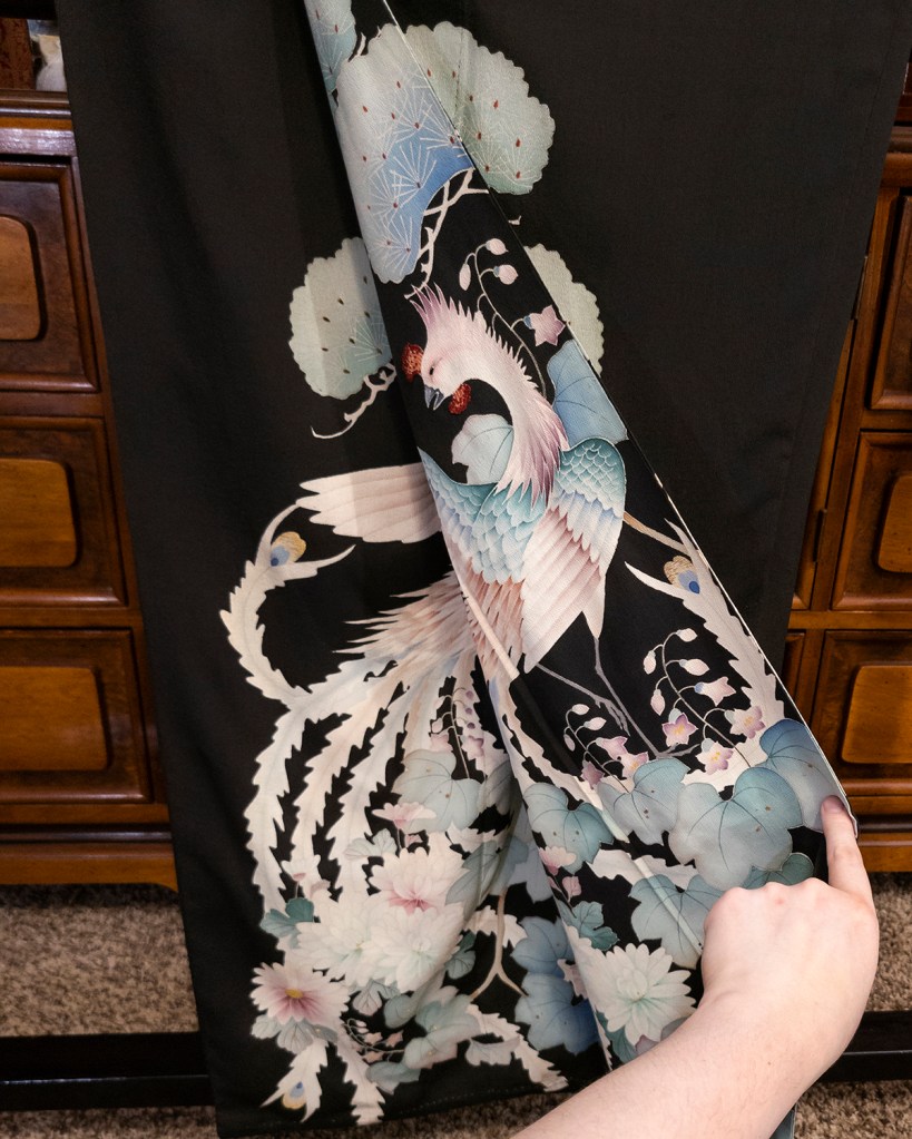 That’s right, I’m calling it a birb. It’s a word I use every day. I have parrots, after all. To be honest about this one, I bought it domestically in a bundle with a maru obi that I’ll detail later. I wanted the obi, and only got an okay-ish look at the kimono, and the price was right, so here we are. The maru obi showed up in fantastic shape, but the kimono needed a little love. That’s okay, I had a lot of love to give. Unfortunately, this was way back before I had any inkling that I would start this blog and take any of you through my restoration processes. So you’ll have to make due with my descriptions. I know, what a goddamn tragedy.