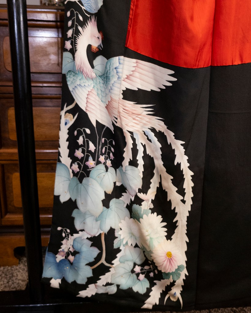 There’s sometimes a lot of fucking guessing educated approximations when it comes to these things in terms of age, but this time I have provenance. The seller is of the original family, and they have had these items since the 1920’s. Based on that beautiful red lining, the fantastic gradations in colors on the foliage and in the bird, and the mirror image of the design that continues inside of the hakakke (lower lining), I’m confident calling this a Taisho Era piece. My picky ass likes having a timeline.