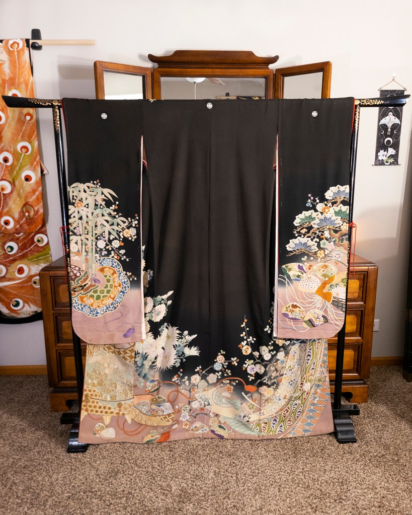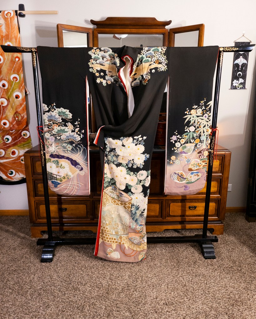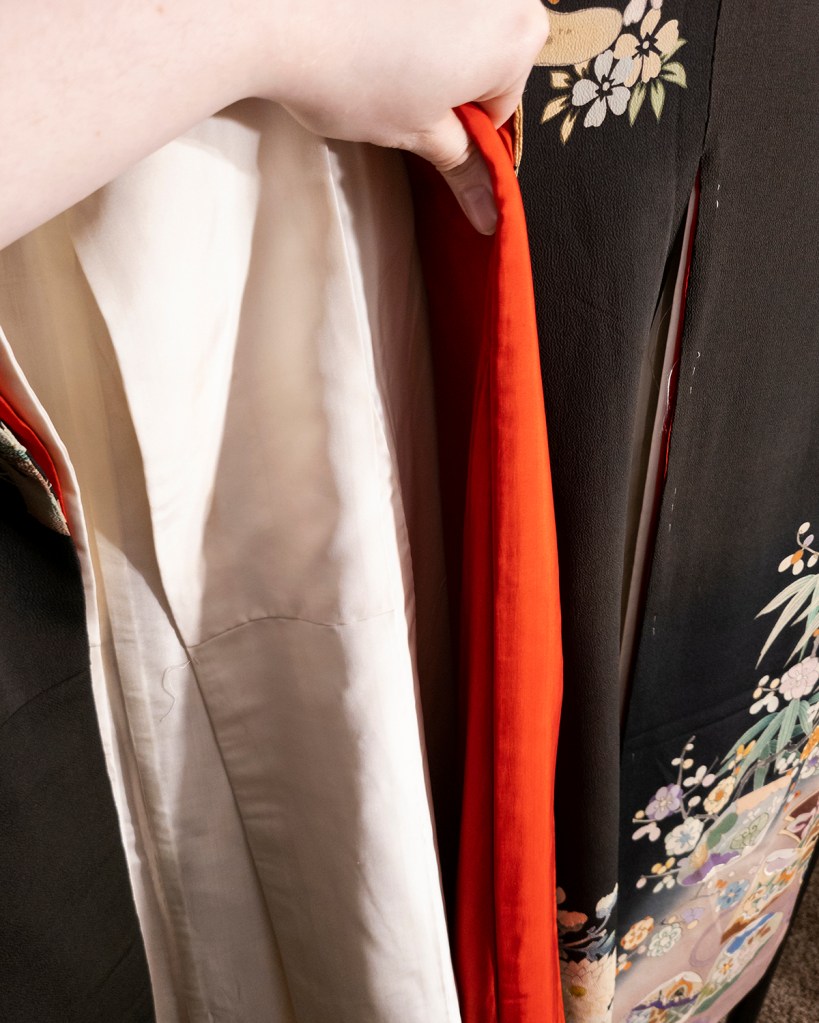How do I accurately describe what I’m thinking right now without just leaning really hard on the all caps and just smashing the keyboard until I feel satisfied? I mean, one could argue that’s what the entirety of this blog is. Your name is just noises you respond to, fucking fight me. This kimono was brought to me with the help of my dear friend, the amazing Roza, because way back when I finished this phenomenal uchikake I decided that I was going to build a bridal ensemble. I’d like it to be made of mostly shit I restored, even though I’m already in my thirties and very married. Since I think the kimono police don’t actually operate in this territory, I’m going to do it anyway.