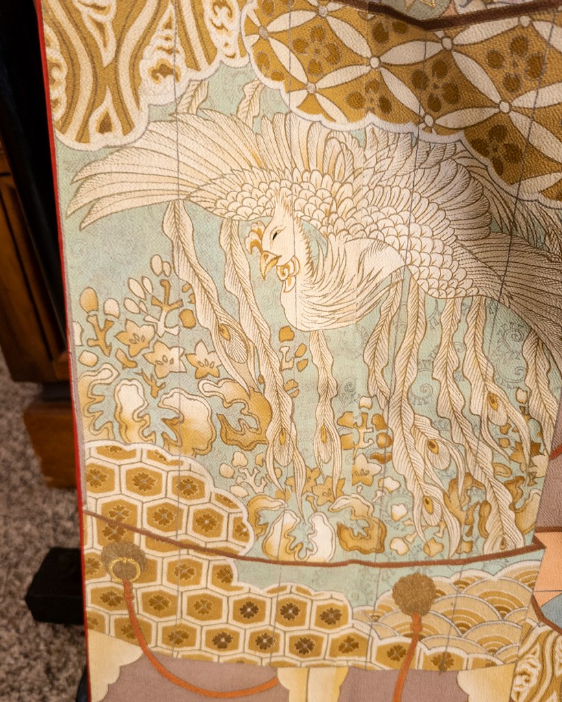 The themes we have here are sho-chiku-bai (this is what it’s called when matsu [pine], ume [plum blossoms], and sasa [bamboo] appear together), sensu (fans) that are decorated themselves with kiku (chrysanthemums) and little gold chocho (butterflies). The body of the kimono itself also has a kai awase game on it–how the fuck do I explain this–think of it kind of like a cute little fortune telling game that’s played with painted shells. The shells are painted with tachibana (citrus), aoi (hollyhock), and a bunch of other flowers that appear elsewhere. There’s also a big-ass Houou (phoenix) on the box. On the right side panel, there’s a large curtain like thing called a kicho, which is just something of a screen divider popular in the Heian period. It shows up on kimono a lot.