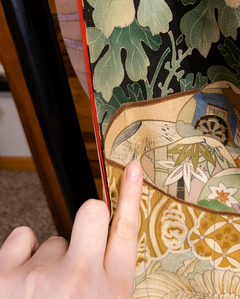 After that, there are a few places that need some sewing help. The sleeves, of course, almost always do. I’m also going to have to pop a lot of seams on this piece in order to get between layers when I start testing for colorfastness and otherwise removing stains, so that’s a whole thing. There are some weak stitches in the couching on some of the kai awase shells, but that’s not a huge thing. I’ll probably be able to just adjust those rather than redo them completely. I didn’t bother to take a picture of that because…well they look fine until you start wiggling them. The fuck am I gonna do, wreck it for a picture? Nah.