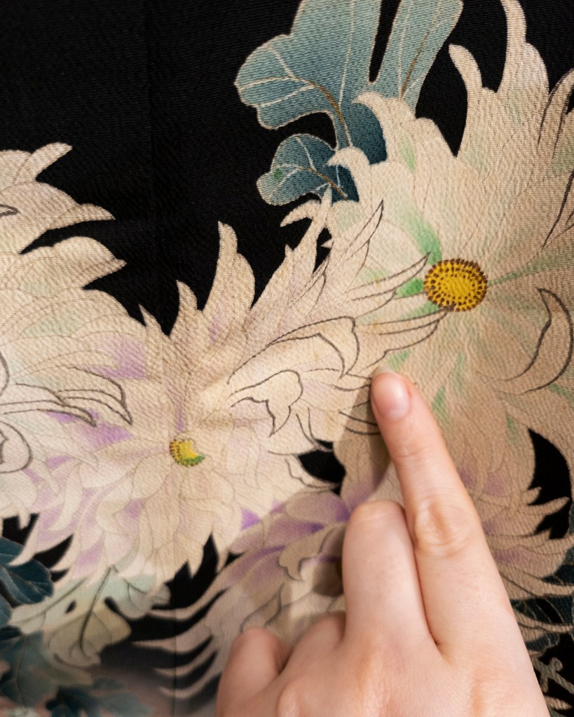 Circling back, why did this make me slap it into Taisho territory? Because when I inspected them closer, and later picked a seam to inspect it from the reverse side of the silk, I find that the original kamon are significantly larger than the applique kamon that covered them. Larger crests are very much a thing of the past in this context–to the point where we would see them falling out of fashion in between the late Meiji Era and into the early to middle Taisho Era.