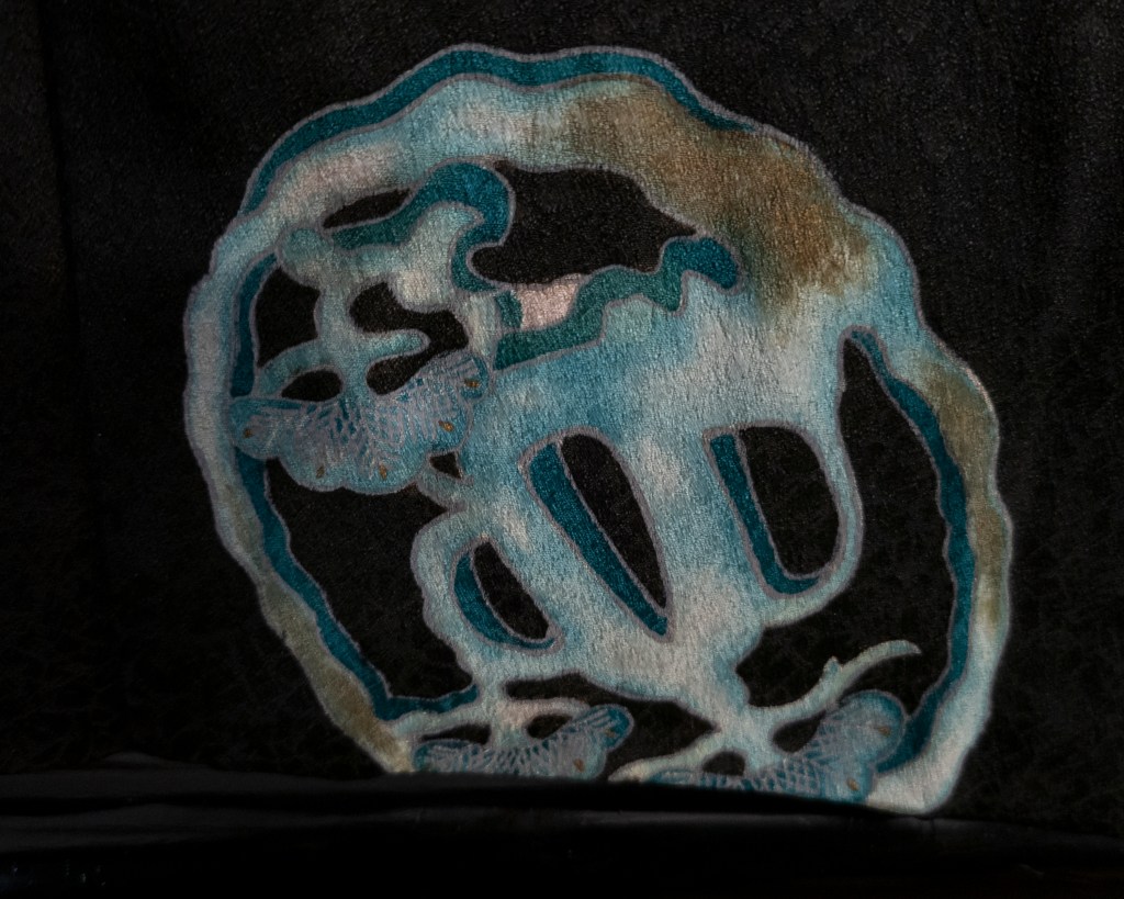 Anyway! Let’s talk about the details. I actually don’t have a great idea of how old this one is; I have zero provenance, so this becomes my best guess. I would say from the size of it, the hard curve on the sleeves, those cute little doves poking out of the sleeve linings there, and the general texture of the silk–I want to put it to earlier middle Showa Era. I should think probably somewhere near the 1950’s. It just feels very much the same as many other items I’ve seen from around then, so it feels like a good guess. It is a goddamn guess, though. Let’s also talk about the amazing texture of that silk! It has an interesting shimmer to it on camera that it also has in life, but it’s a very matte finish. Up close, as you can see, it has a crackled design. I hesitate to call it the “cracked ice” theme that I see every here and again–honestly it reminds me of lizard skin. All over this haori are brightly colored tsuba (traditional katana [sword] guards), and most of them are even detailed with a bit of kinsai (gold paint) to give them a forged-metal appearance. It’s an attention to detail that makes my inner illustrator giggle with joy, and my outer wacko chortle like a beaver.