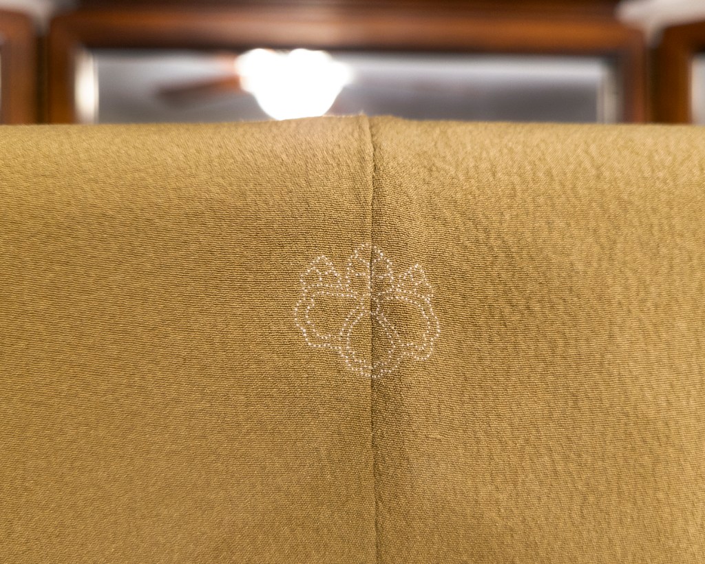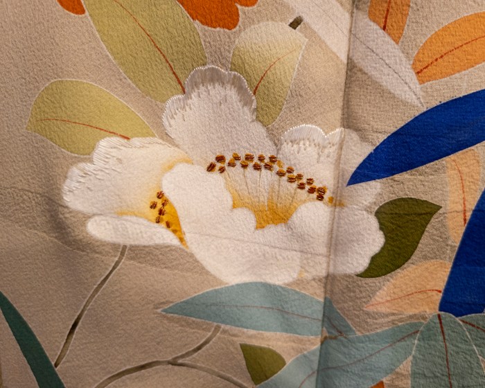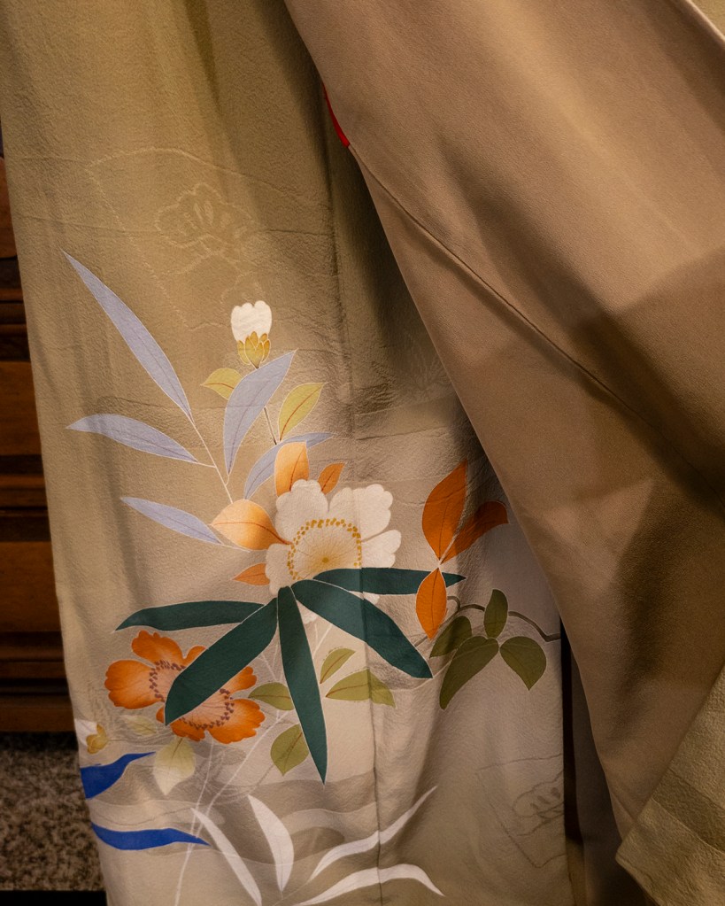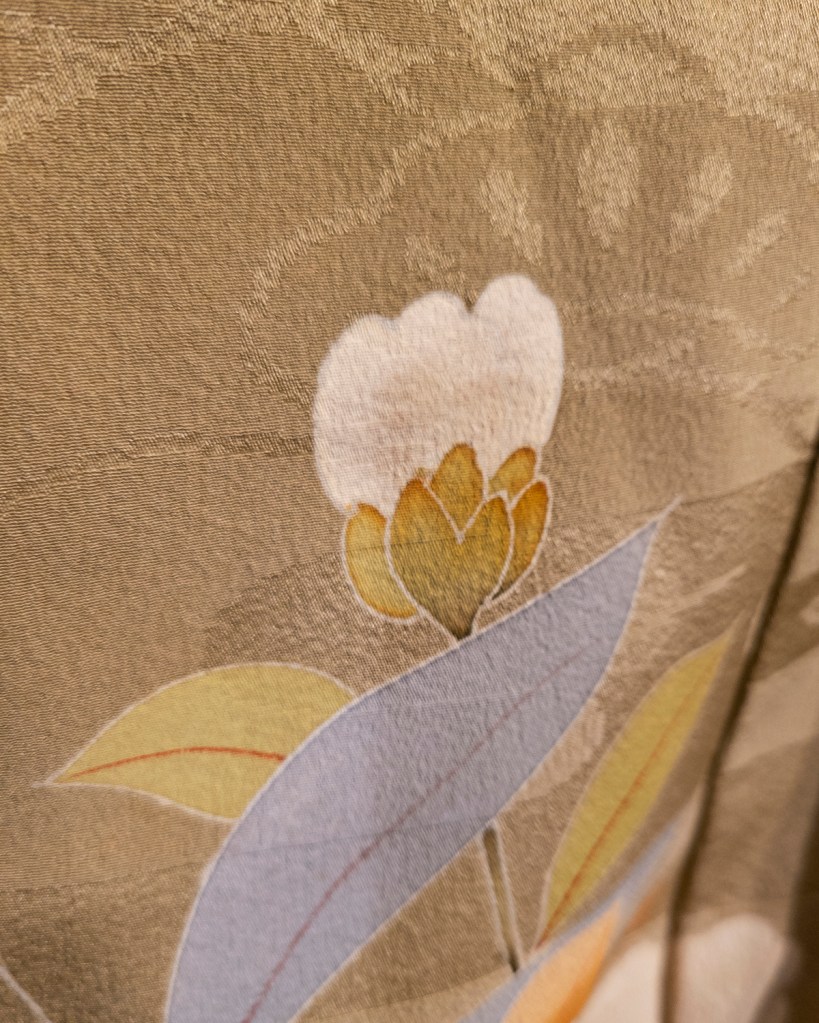 So we’ve got a decidedly summer flower on an awase kimono. Actually, the presence of the red berries, which I think are nandina (“sacred” bamboo), as well as the kiku (chrysanthemums) makes this quite the summery dress, doesn’t it? On the one hand, you can wear awase whenever. On the other, I’m baking alive looking at it. Because you see the amazing textures in that rinzu (woven pattern) silk? It’s thick as hell. This is not a light, sheer garment. It has some heft to it.