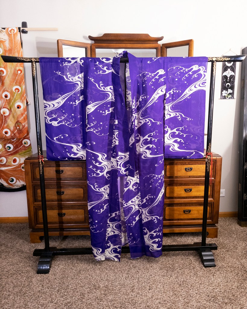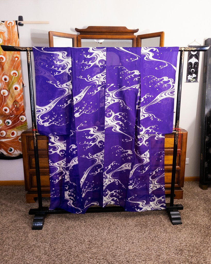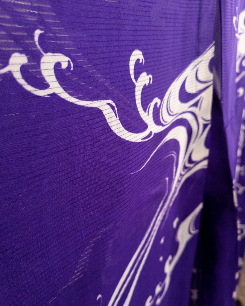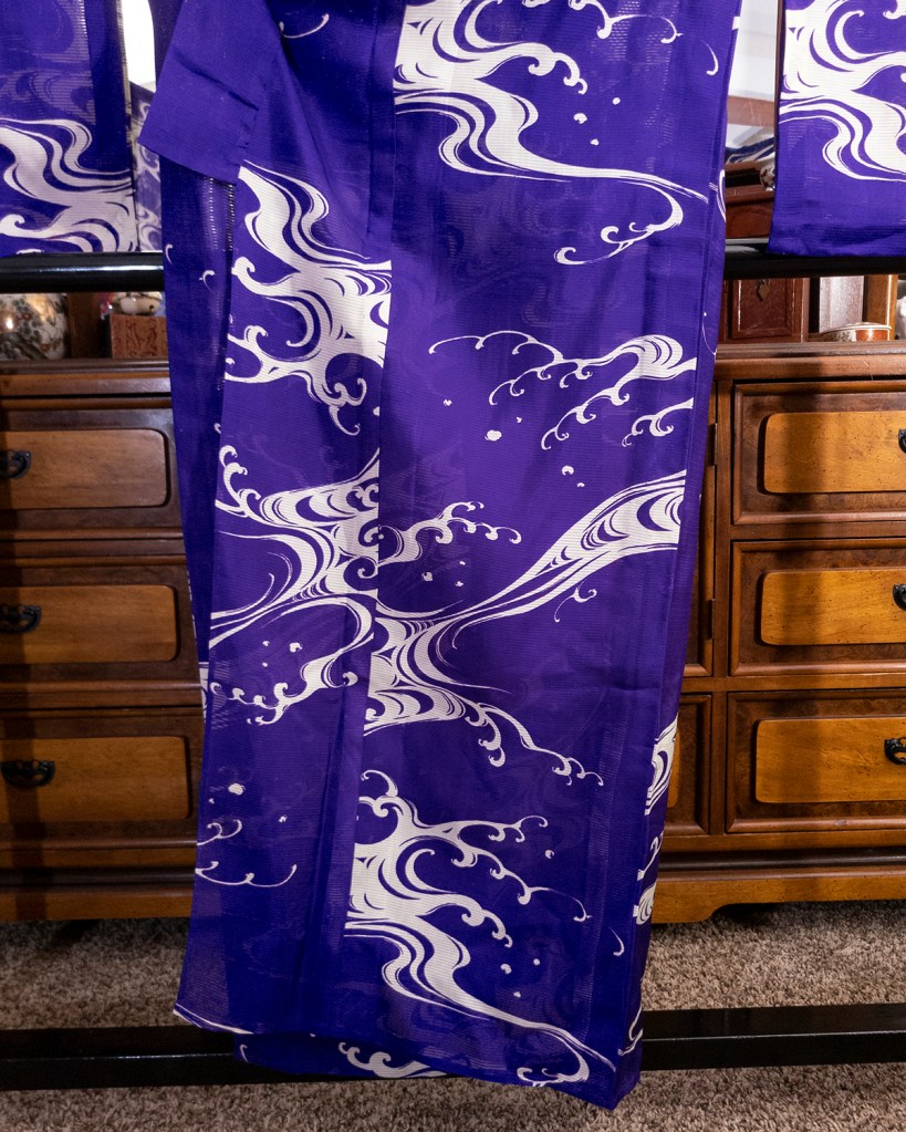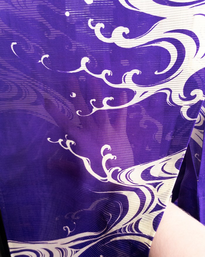 This piece was a colossal pain in the ass to photograph. I had to do color correction on the body of the kimono, so I apologize if it seems a bit processed. I’m not a great photographer to begin with, but I am a Photoshop expert. I mean that literally. The kimono photographs blue. It’s purple. The damn thing is purple. So that was a thing I had to handle. I wanted it to appear correctly, and while I couldn’t make my camera do the fucking needful, I can just fix it later. The big white nami (waves) are as accurate as they are in person, though. So I’ve got that going for me.