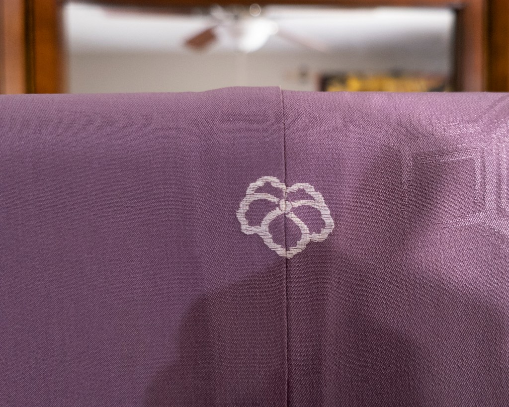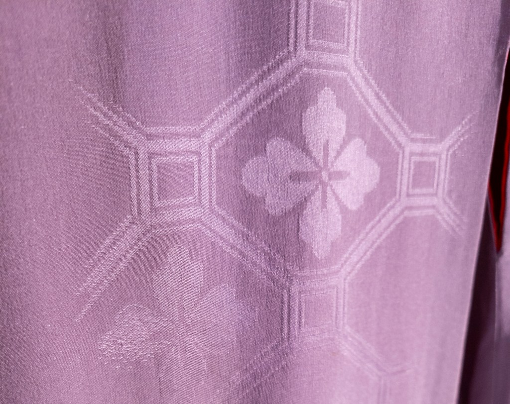 It has a single tsuta (ivy) kamon (family crest) embroidered on the back. All over is a delightful rinzu (woven) pattern, which I believe to be a variant of kikko (tortoiseshell pattern, often with a flower in the center of each block), in discontinuous blocks all over the body of the kimono. The skirt is decorated with a bright himo (cord) and blooming botan (peony). It’s that vibrant orange on lavender that got me. That’s why I stalked this one like a tiger on that grew thumbs and found a machete.