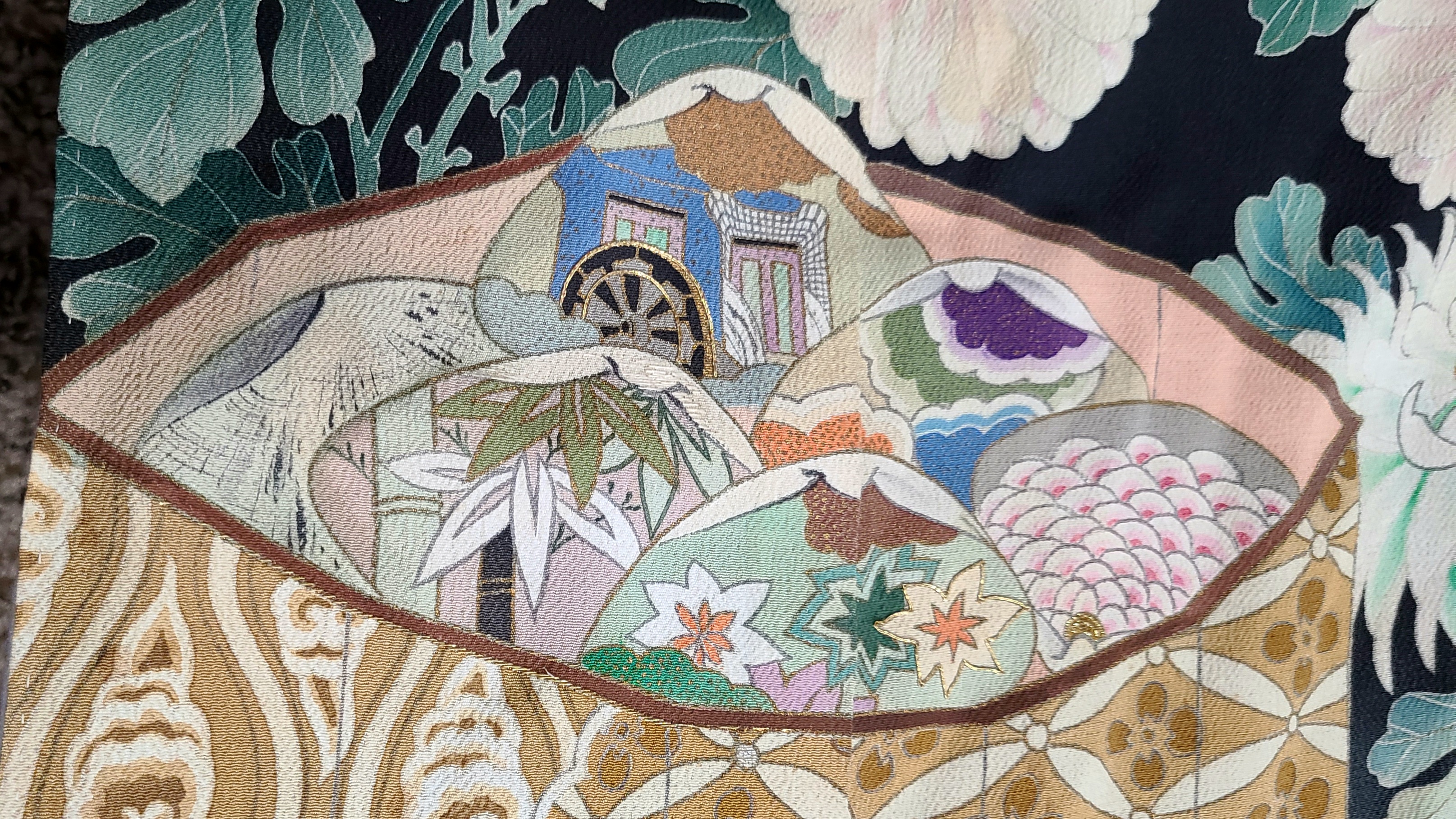 This image crosses over two panels, so you can tell that one of the panels was less affected than the other. But compared to the lid of the box depicted elsewhere on the kimono, they’re both pretty washed out.