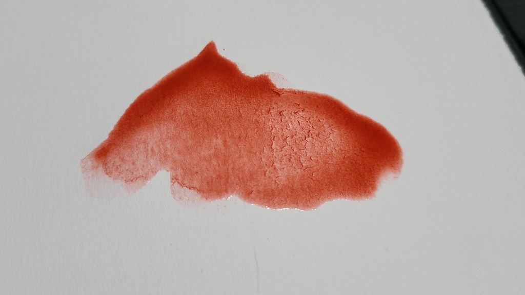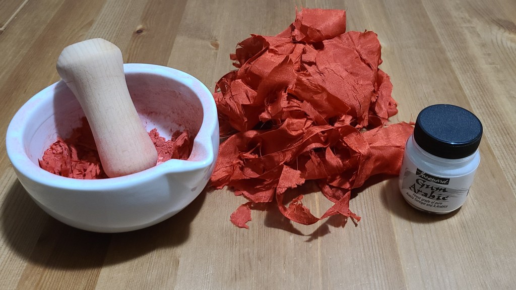 So guess what? I just made a red watercolor out of shattering silk lining. I don’t know if anyone has ever done that before, but now I have. And I like the red. It’s a screaming blood red, and it actually mixes well and consistently with other pigments.