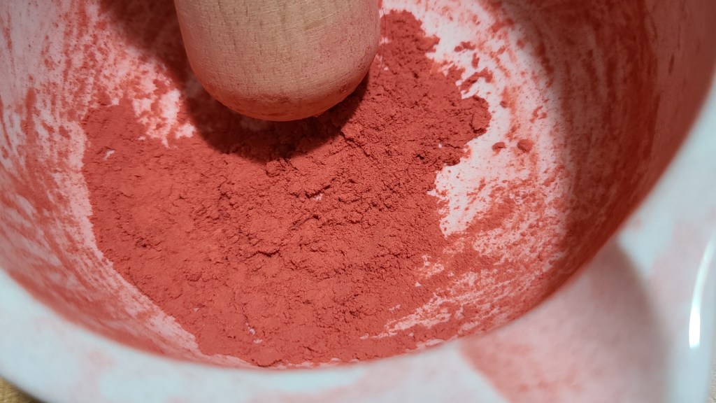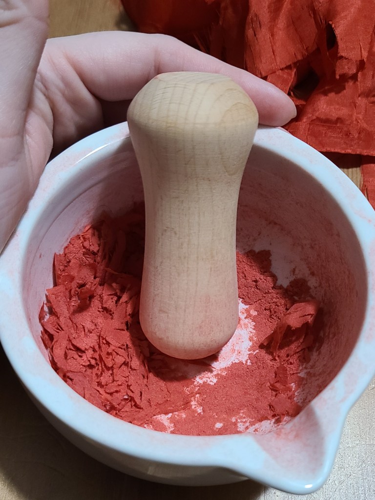 So what I’m doing here is grinding the shattered silk lining from a Taisho Era kimono in a mortar and pestle with powdered gum Arabic. I’d like to take this moment to point out that I’m a wacko and not a fucking idiot, and that this mortar and pestle has never and will never be used for food related preparations. If you lose your own goddamn mind and decide you want to try this, I recommend not using your favorite spice grinder.