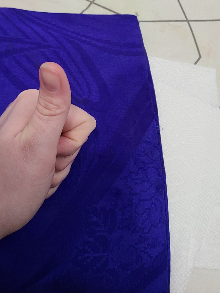 The next thing we need to do is pick the seam closest to the stain so that we can get a towel or bunch of paper towels between the shell and the lining. If you aren’t confident with opening and closing a seam for this purpose, I got you, bruh. And as you can see here, I have a dummy thicc wad of paper towels tucked in here. Behold: