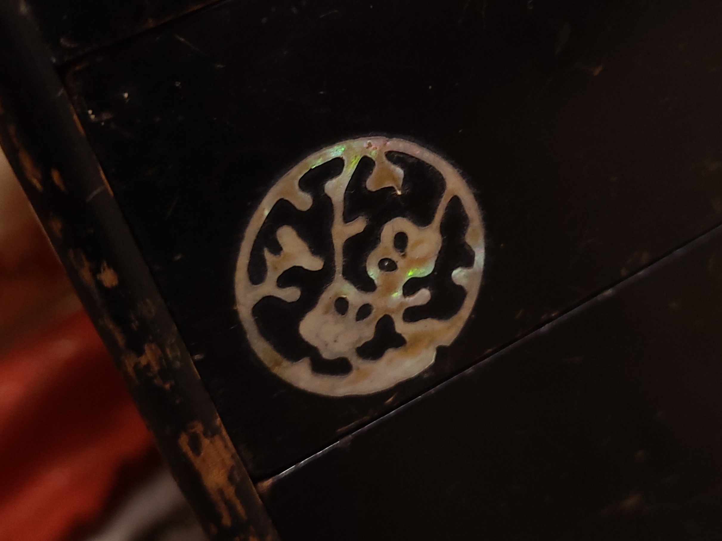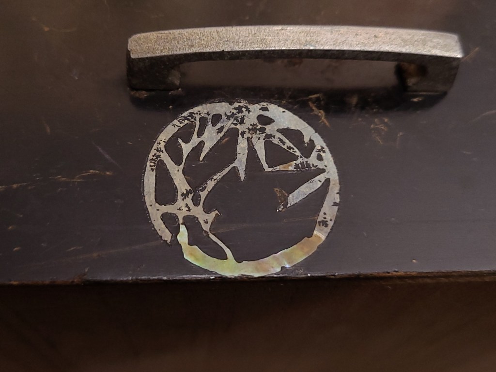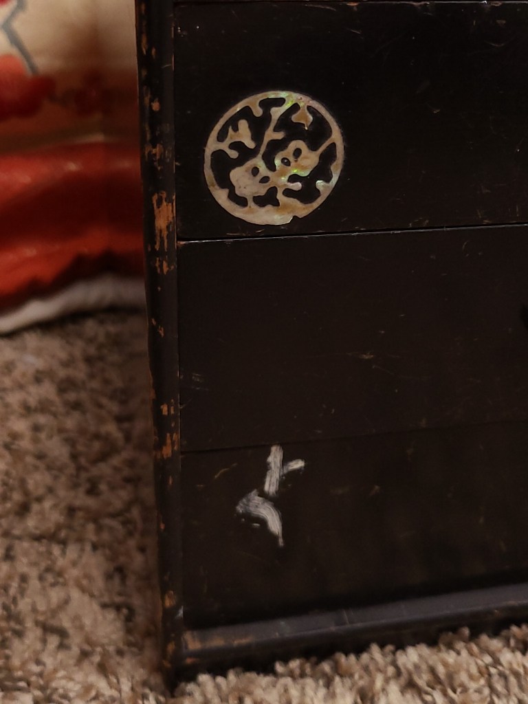 Legit, that’s not rust. Pretty much right after I took these pictures, I gave the whole thing a quick wash. Just mild soap and warm water for items like this to remove surface grime–lacquer thinner is for later. This thing was pretty filthy, actually. But all of the hardware is in good repair, so it’s not too much of a concern. My biggest challenge is going to be the bamboo inlay, because it’s chipped all to fuck.