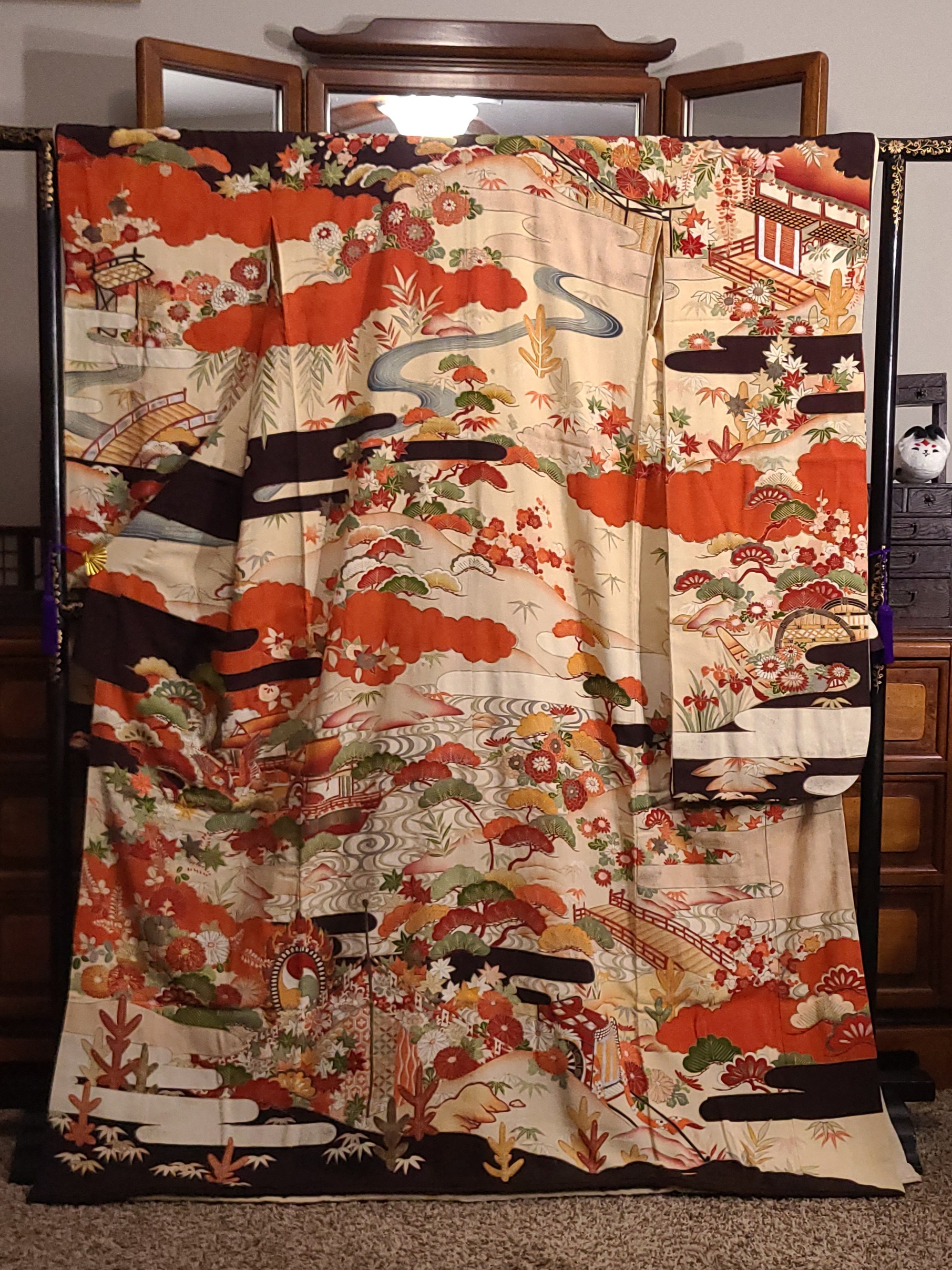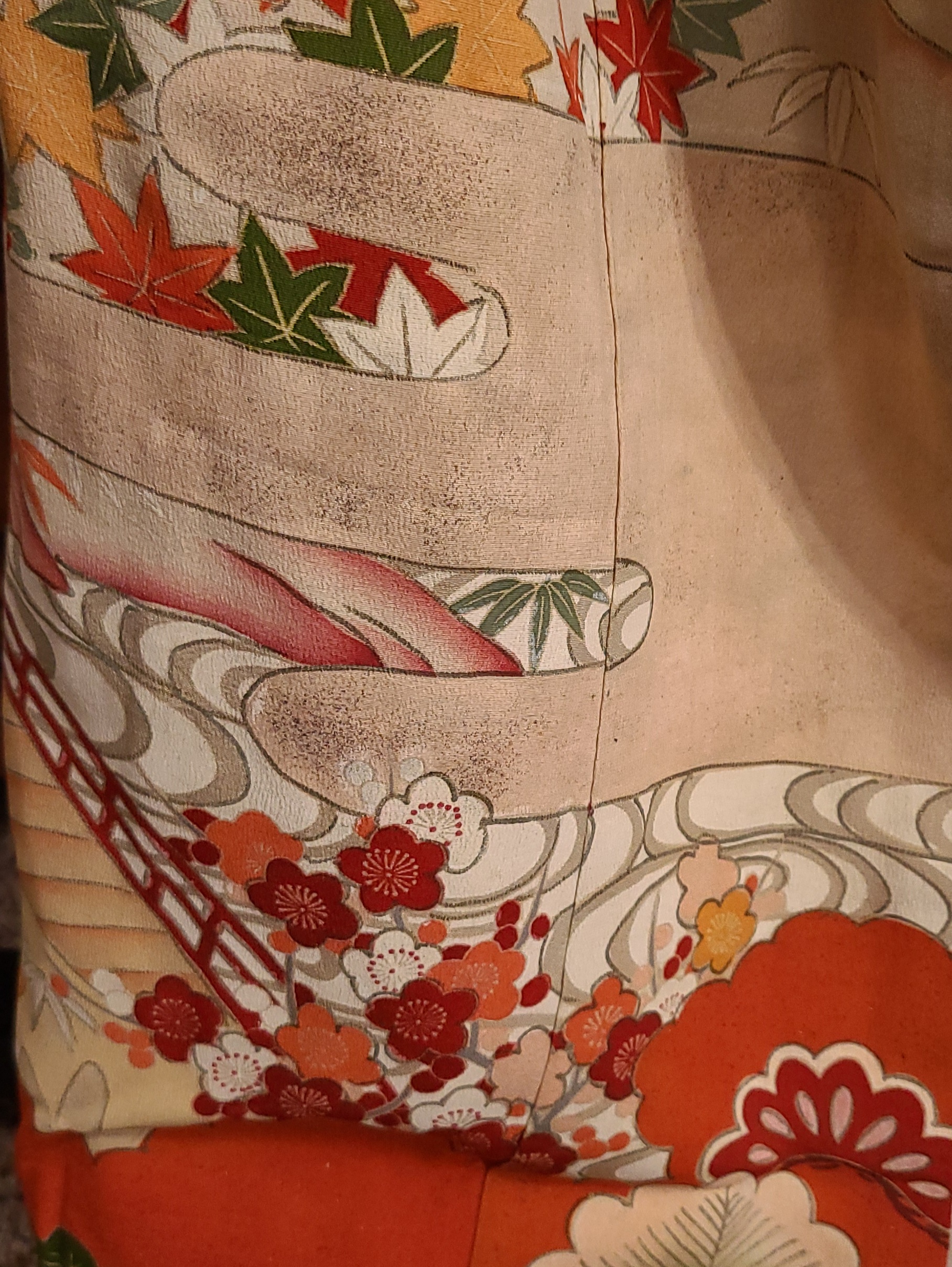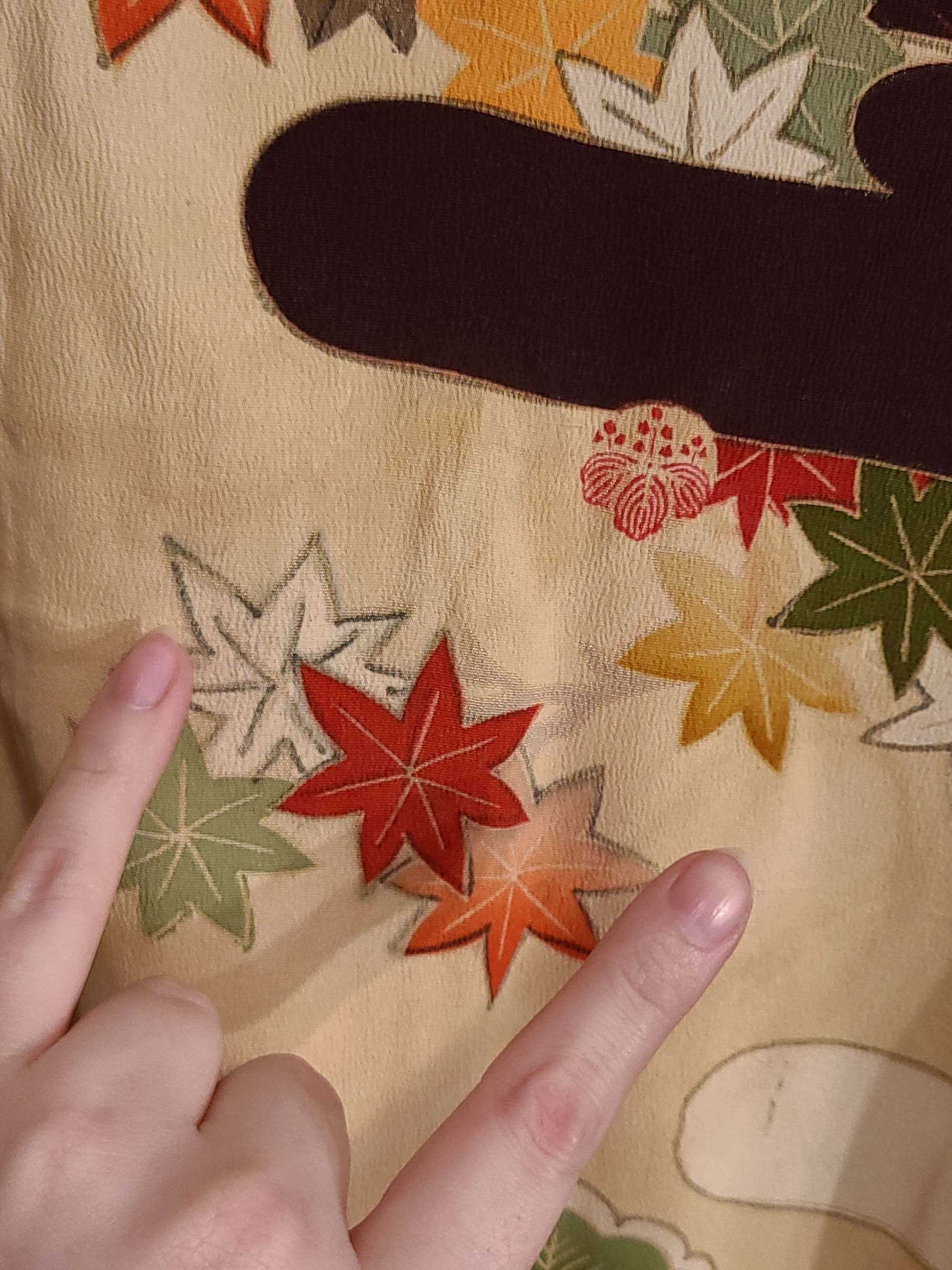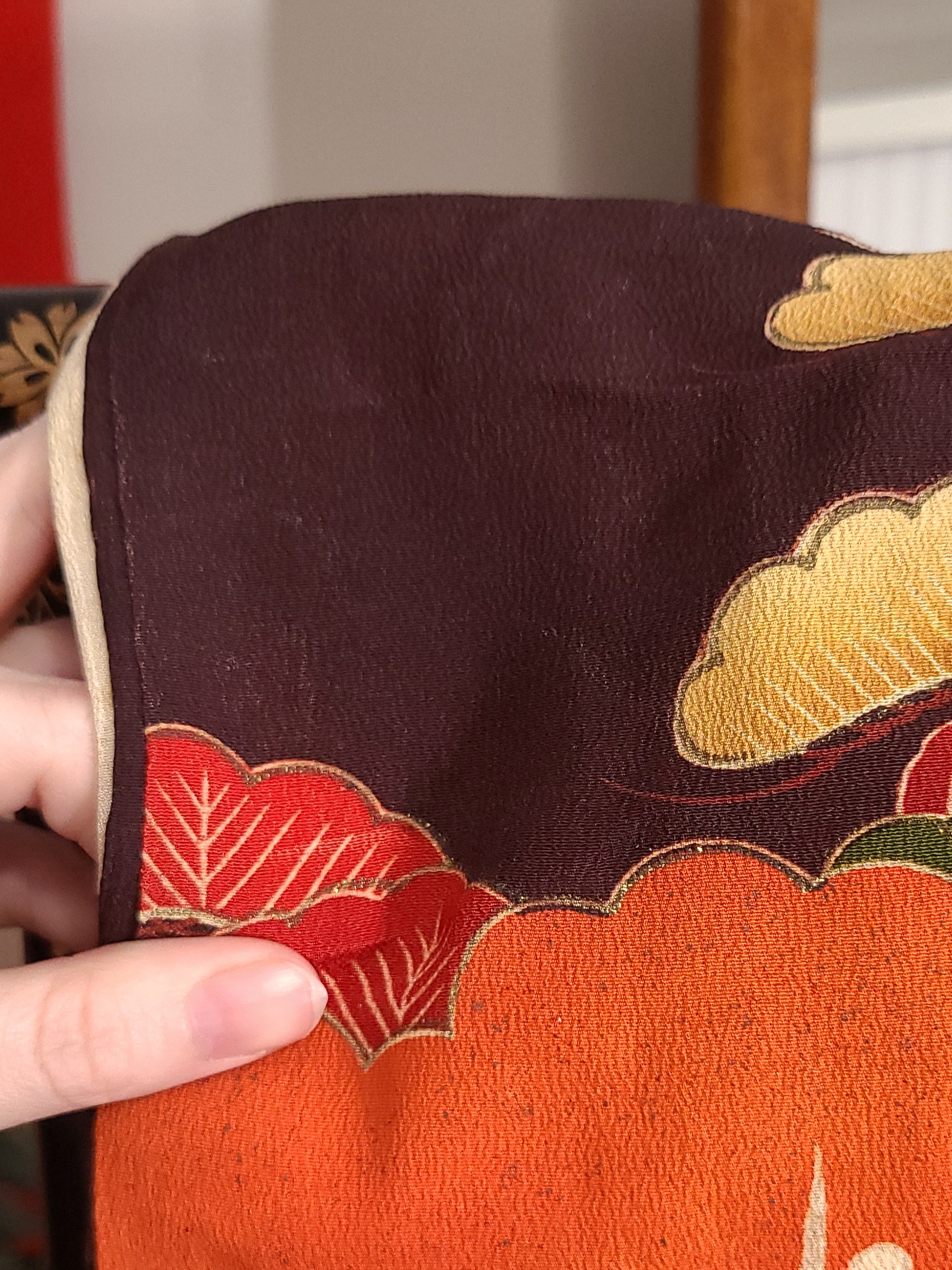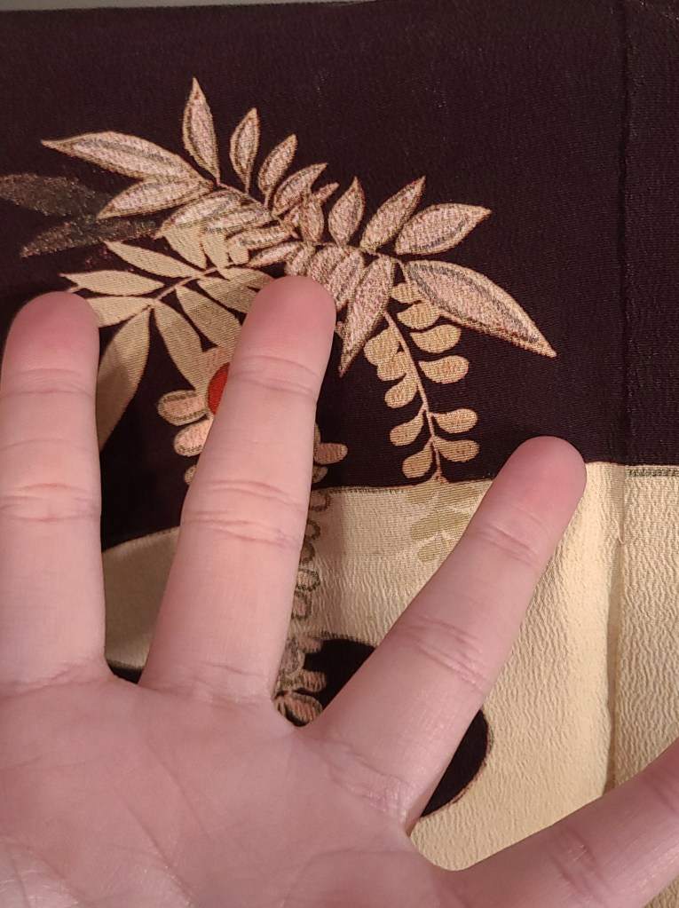 The seller referred to it as a “hikizuri” which has a connotation among English only speaking kimono fans of being geisha related. I don’t feel like having this argument, so I won’t. At 170cm (that’s five foot six inches and a little over in Freedom Unitsâ„¢) it is probably not that in any context. It does however have a highly decorated hakkake, and a dummy thicc padded hem. They also referred to it as an antique, and I’ve got zero provenance. My inspection didn’t turn up any signatures, and it has a cream colored lining. I’d ballpark this in the 1930’s because I’m getting real fucking confident about shit like that. Fight me. I settled on hikifurisode because it is that, at least, at a glance.