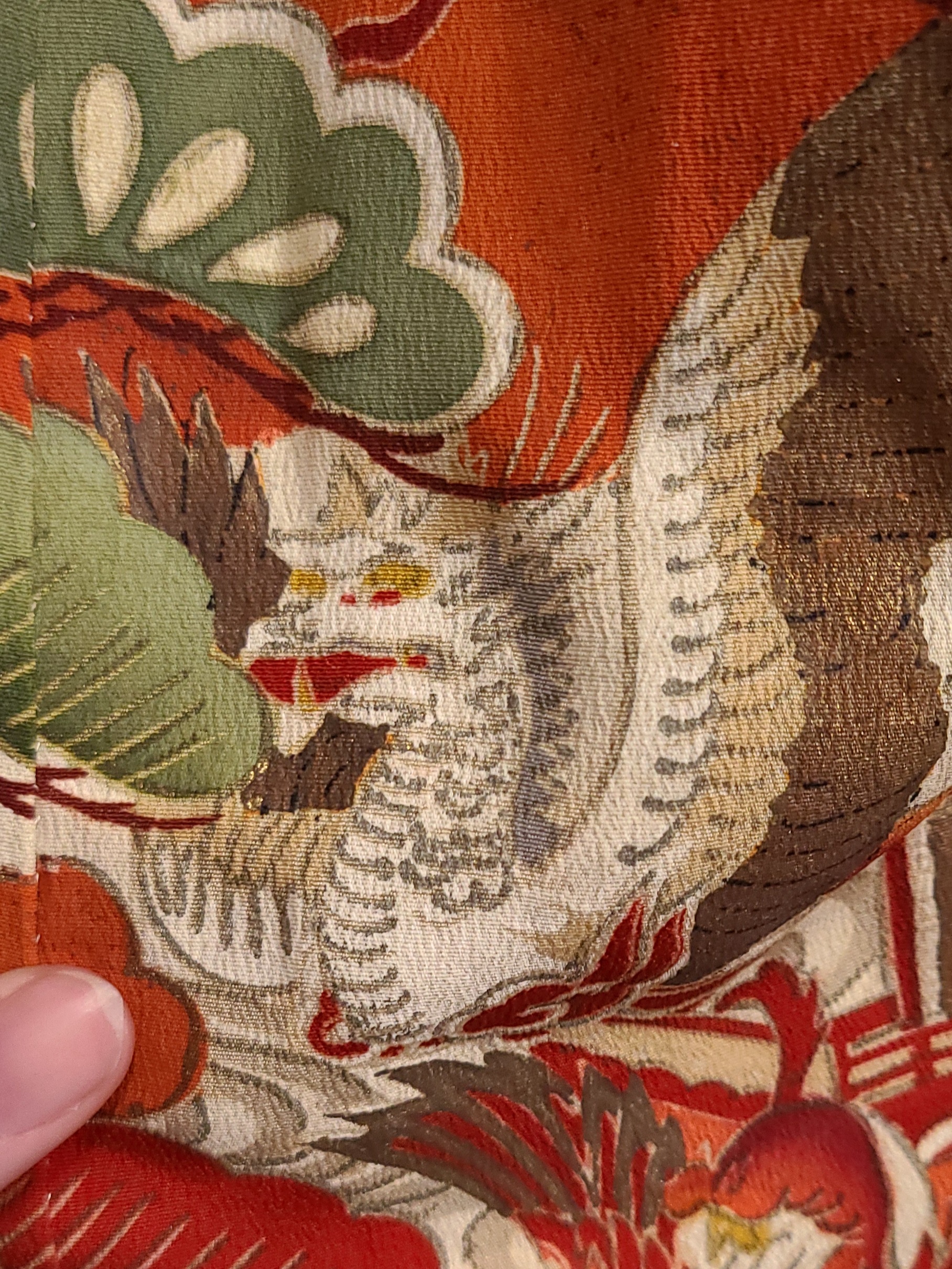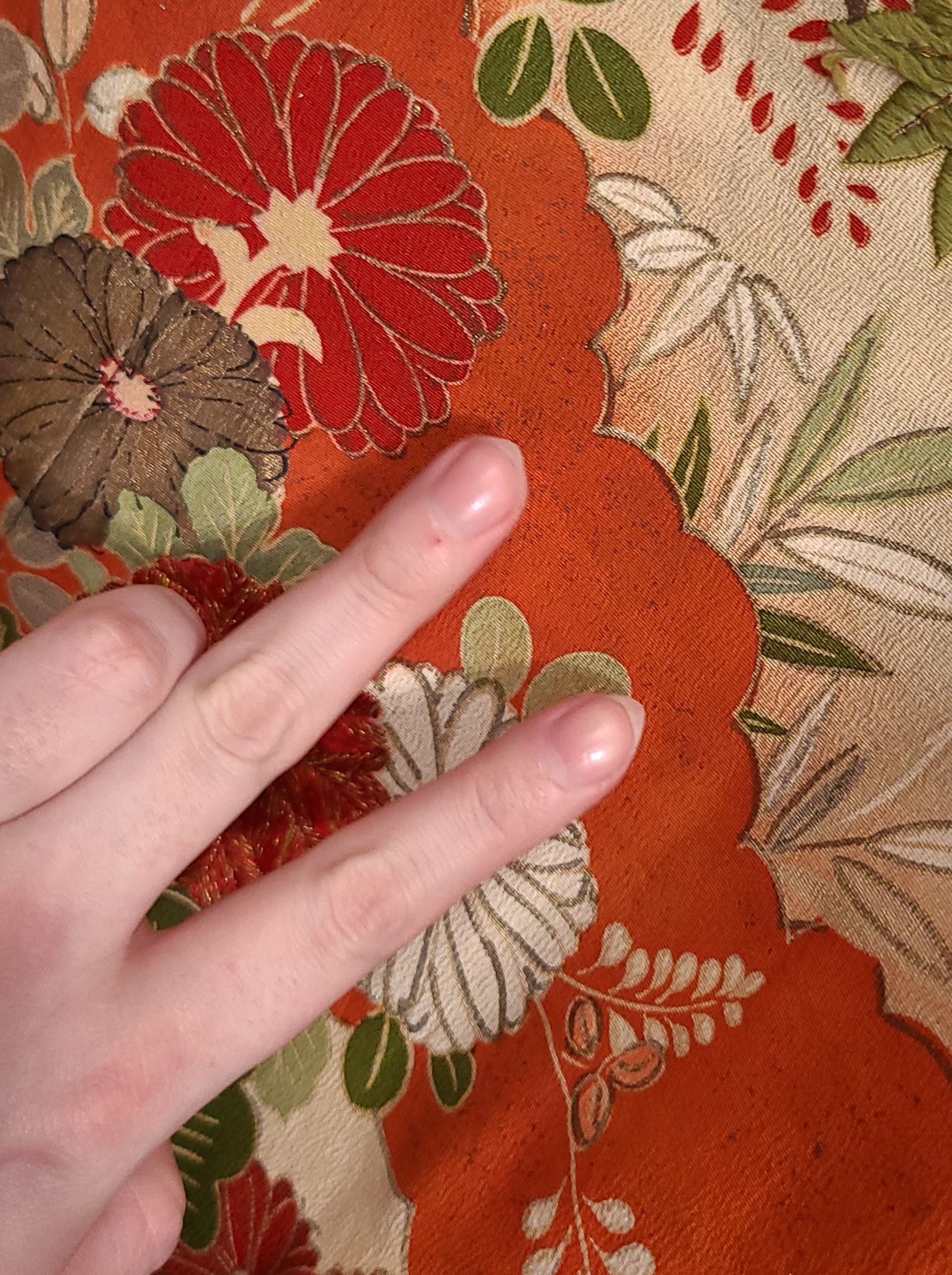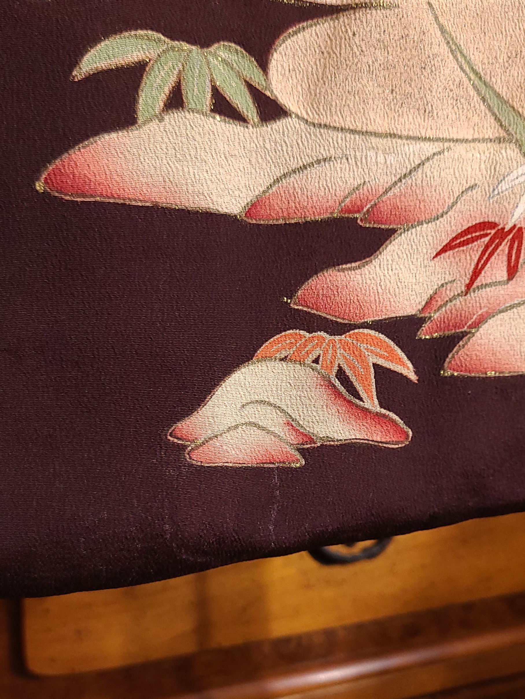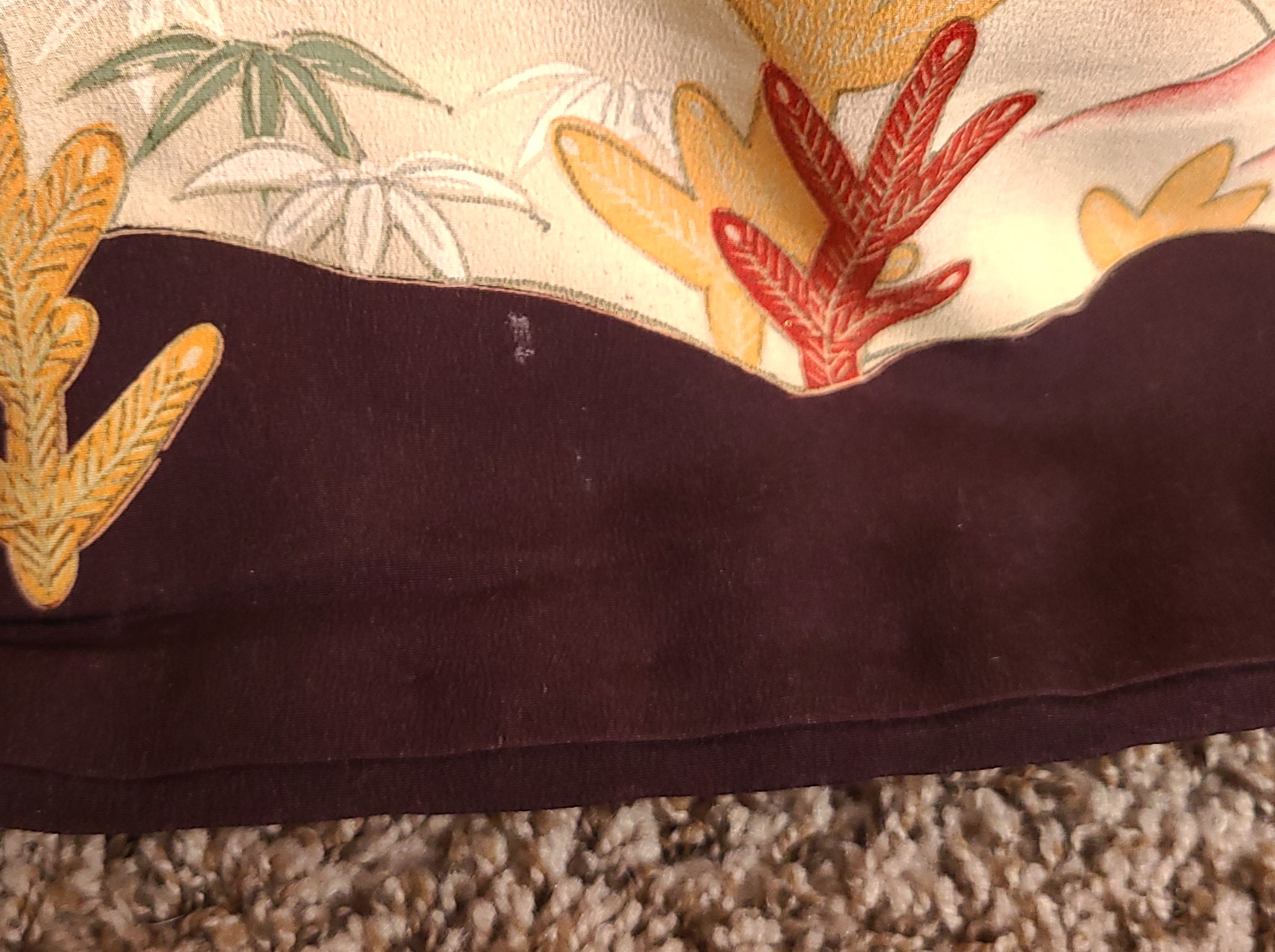 The seller referred to it as a “hikizuri” which has a connotation among English only speaking kimono fans of being geisha related. I don’t feel like having this argument, so I won’t. At 170cm (that’s five foot six inches and a little over in Freedom Unitsâ„¢) it is probably not that in any context. It does however have a highly decorated hakkake, and a dummy thicc padded hem. They also referred to it as an antique, and I’ve got zero provenance. My inspection didn’t turn up any signatures, and it has a cream colored lining. I’d ballpark this in the 1930’s because I’m getting real fucking confident about shit like that. Fight me. I settled on hikifurisode because it is that, at least, at a glance.